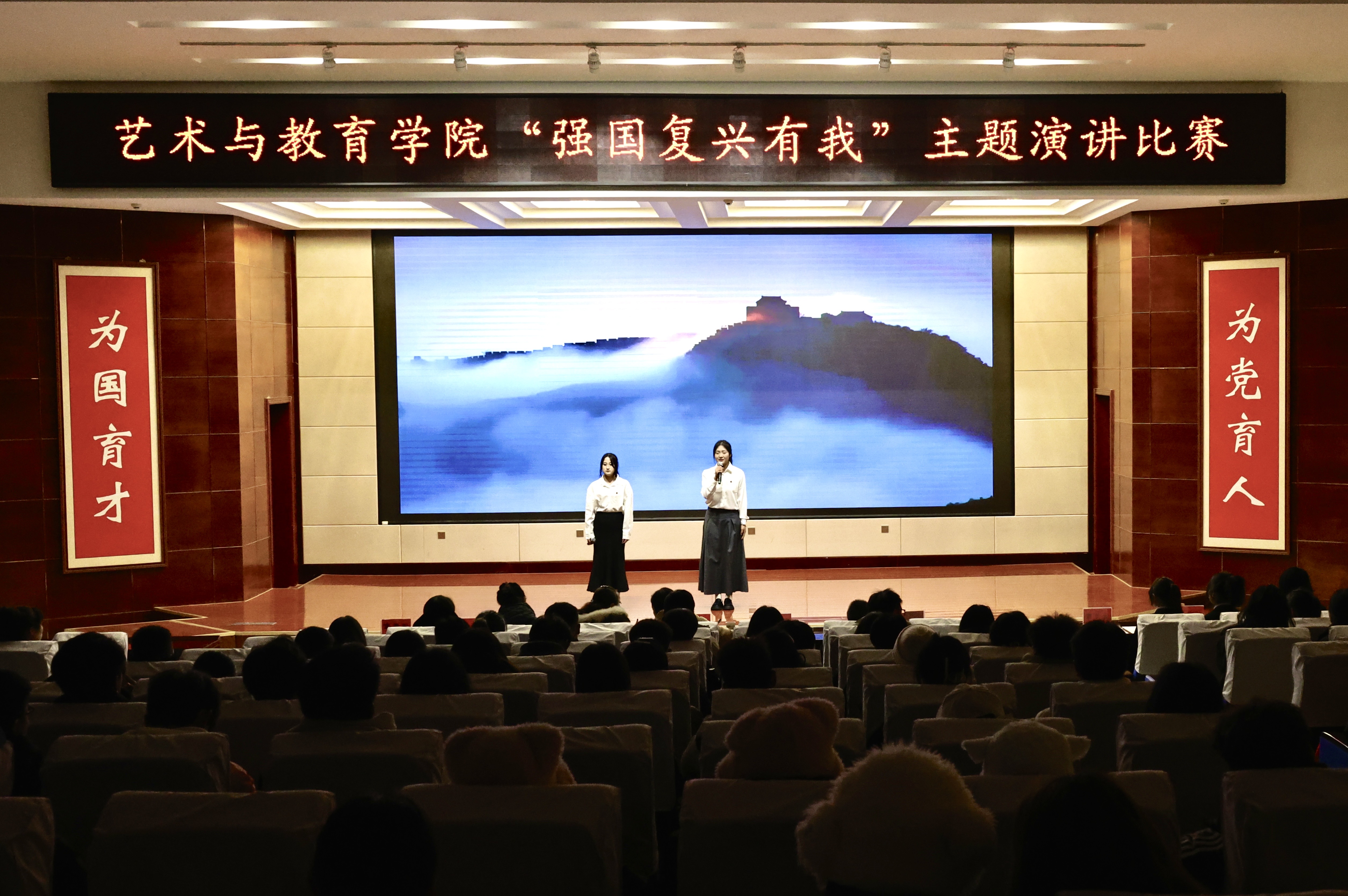 為弘揚(yáng)愛(ài)國(guó)主義精神,激發(fā)學(xué)生愛(ài)國(guó)情懷,12月20日晚,藝術(shù)與教育學(xué)院團(tuán)委在菁英廳舉辦“強(qiáng)國(guó)復(fù)興有我”主題演講比賽。學(xué)院200余名師生觀看了比賽。