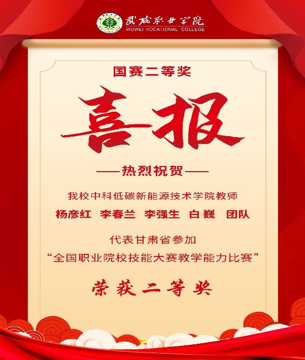 近日,2023年全國職業(yè)院校技能大賽教學能力比賽決賽在江西現(xiàn)代職業(yè)技術(shù)學院落下帷幕,由中科低碳新能源學院教師楊彥紅、李春蘭、李強生、白巍組成的參賽團隊作為甘肅省唯一一支打入國賽決賽的團隊,代表甘肅省參加比賽,喜獲專業(yè)課程高職一組二等獎。