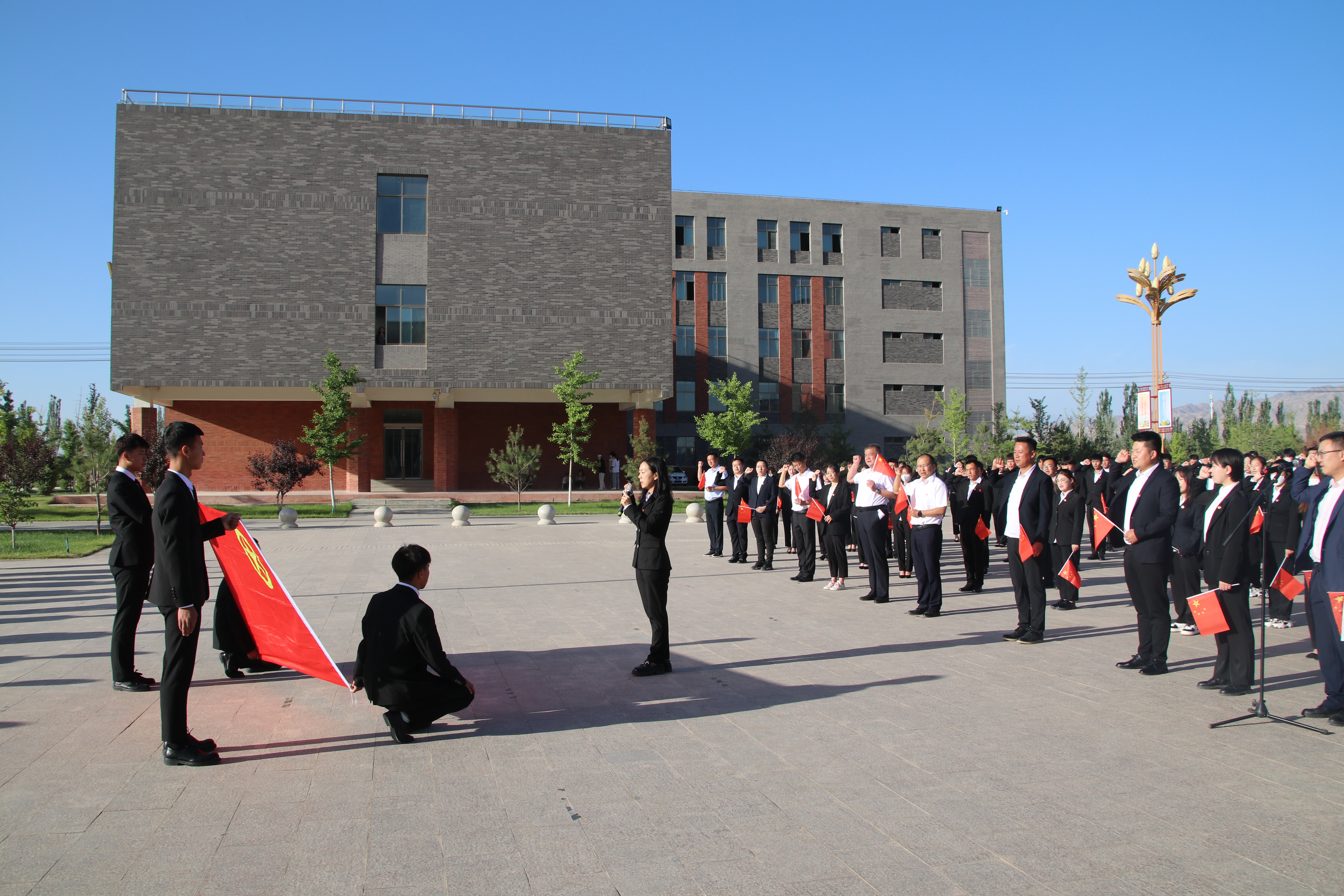 迎著朝陽,五星紅旗在國旗護(hù)衛(wèi)隊的護(hù)送下緩緩入場,昂昂國歌奏響,國旗迎風(fēng)飄揚(yáng),全場師生齊唱國歌。學(xué)生代表在國旗下致獻(xiàn)詞,對黨許下青春的誓言,獻(xiàn)詞之后舉行了嚴(yán)肅莊重的重溫入團(tuán)誓詞儀式,增強(qiáng)了共青團(tuán)員的組織光榮感和歸屬感,激發(fā)了團(tuán)員青年的使命感和責(zé)任感。最后,全體團(tuán)員青年齊唱《共青團(tuán)團(tuán)歌》,用響亮的歌聲表達(dá)建團(tuán)百年再出發(fā)的祝福,現(xiàn)場愛國熱情持續(xù)高漲。