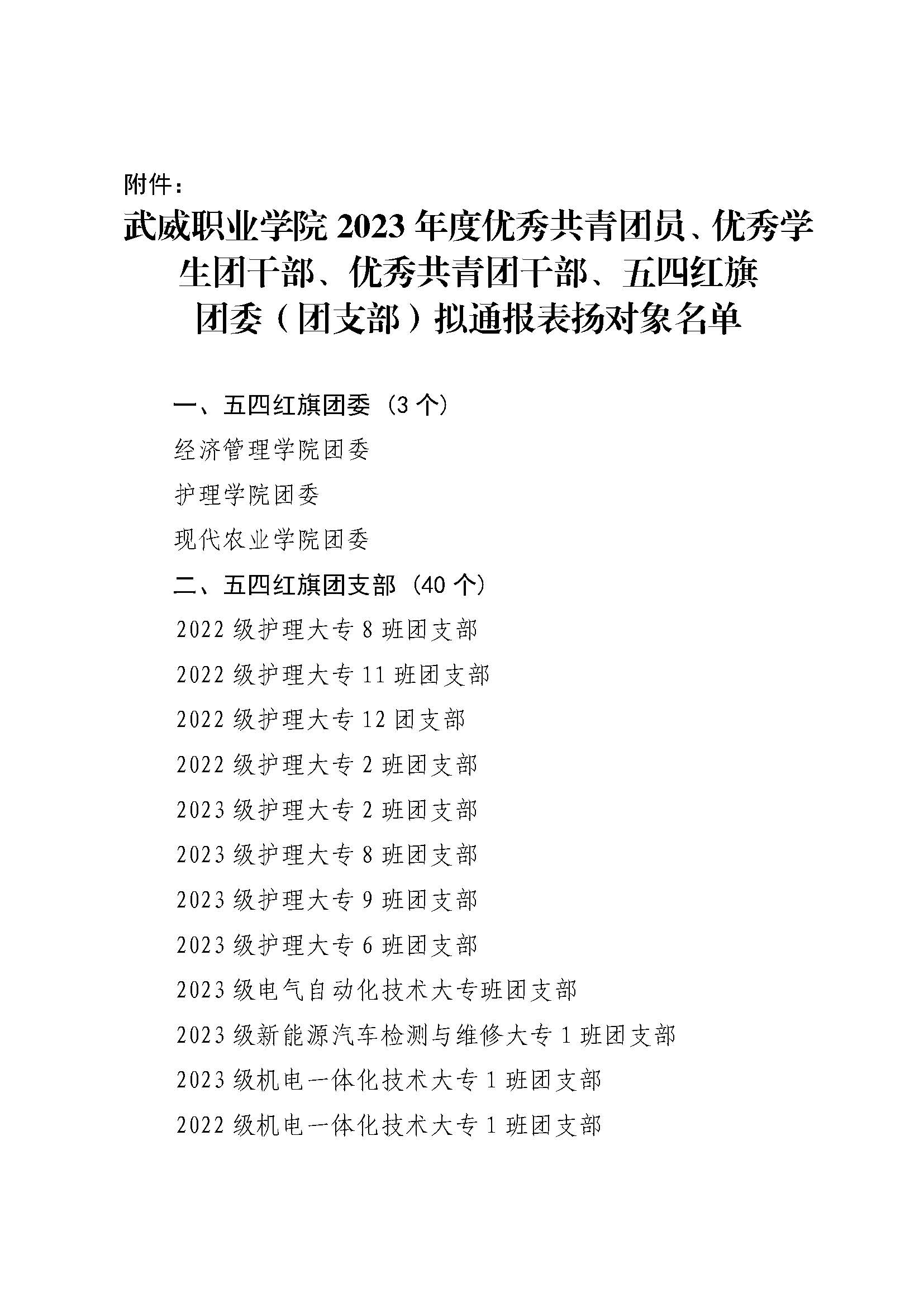 關(guān)于武威職業(yè)學(xué)院2023年度優(yōu)秀共青團(tuán)員、優(yōu)秀學(xué)生團(tuán)干部、優(yōu)秀共青團(tuán)干部、五四紅旗團(tuán)委(團(tuán)支部)擬通報(bào)表?yè)P(yáng)對(duì)象的公示