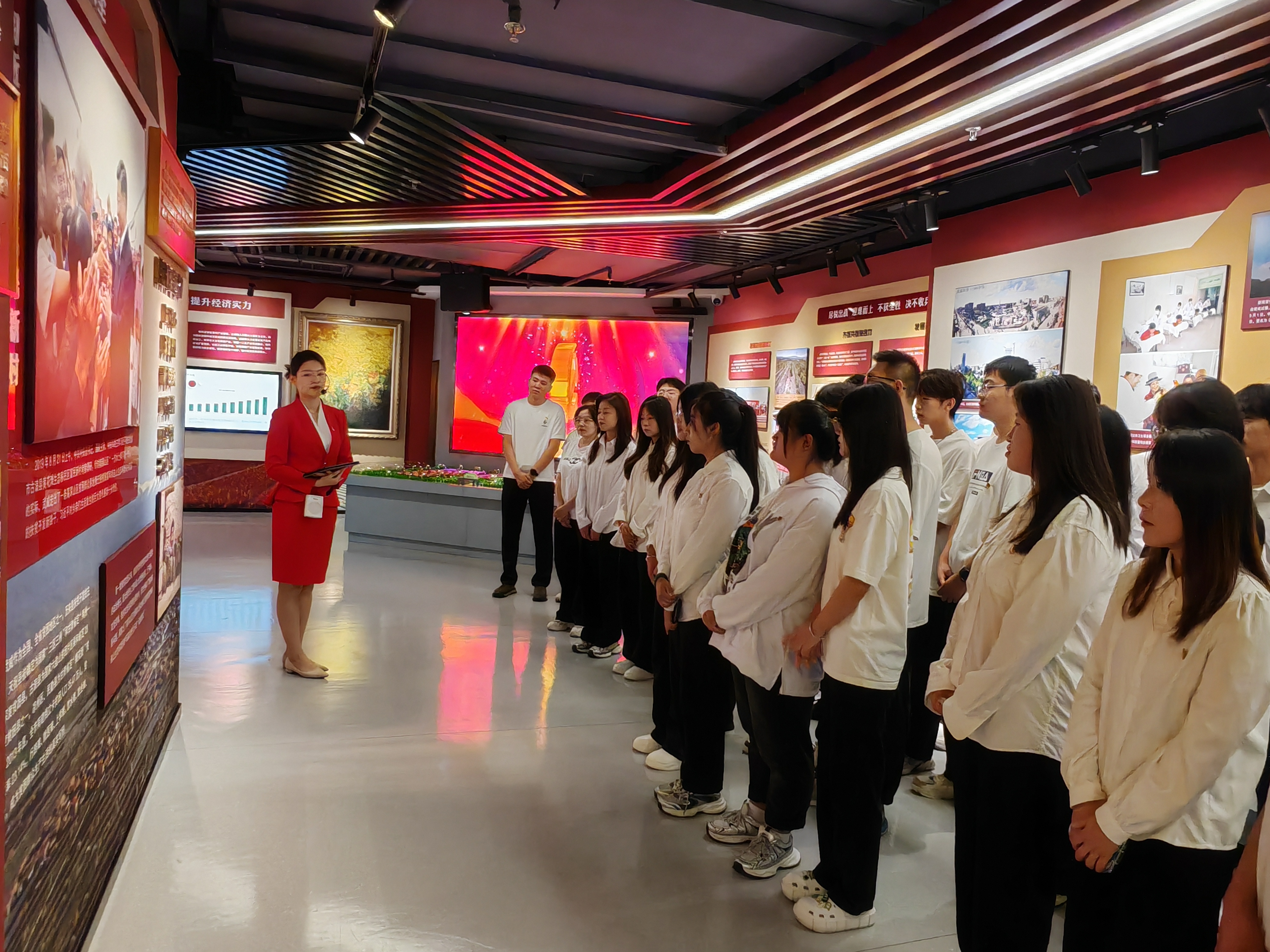師生們在講解員的帶領下依次參觀了教育館的序廳、主廳、智慧黨建廳、紅色文創(chuàng)廳、尾廳以及初心講堂。每一個展廳都承載著豐富的歷史內涵,記錄了中國共產黨在不同歷史時期帶領人民取得的偉大成就。同學們認真聆聽講解員的解說,仔細觀看館內展出的珍貴圖片、文獻資料、歷史實物和視頻影像,全面了解了武威人民在黨的領導下,一步步克服困難、取得勝利的過程。隨后師生們觀看了紅色專題片《先鋒之光》。影片生動再現了無數革命先烈為了國家獨立、民族解放和人民幸福所付出的巨大犧牲與貢獻,從影片中汲取了愛國、拼搏、團結和克難的精神力量。