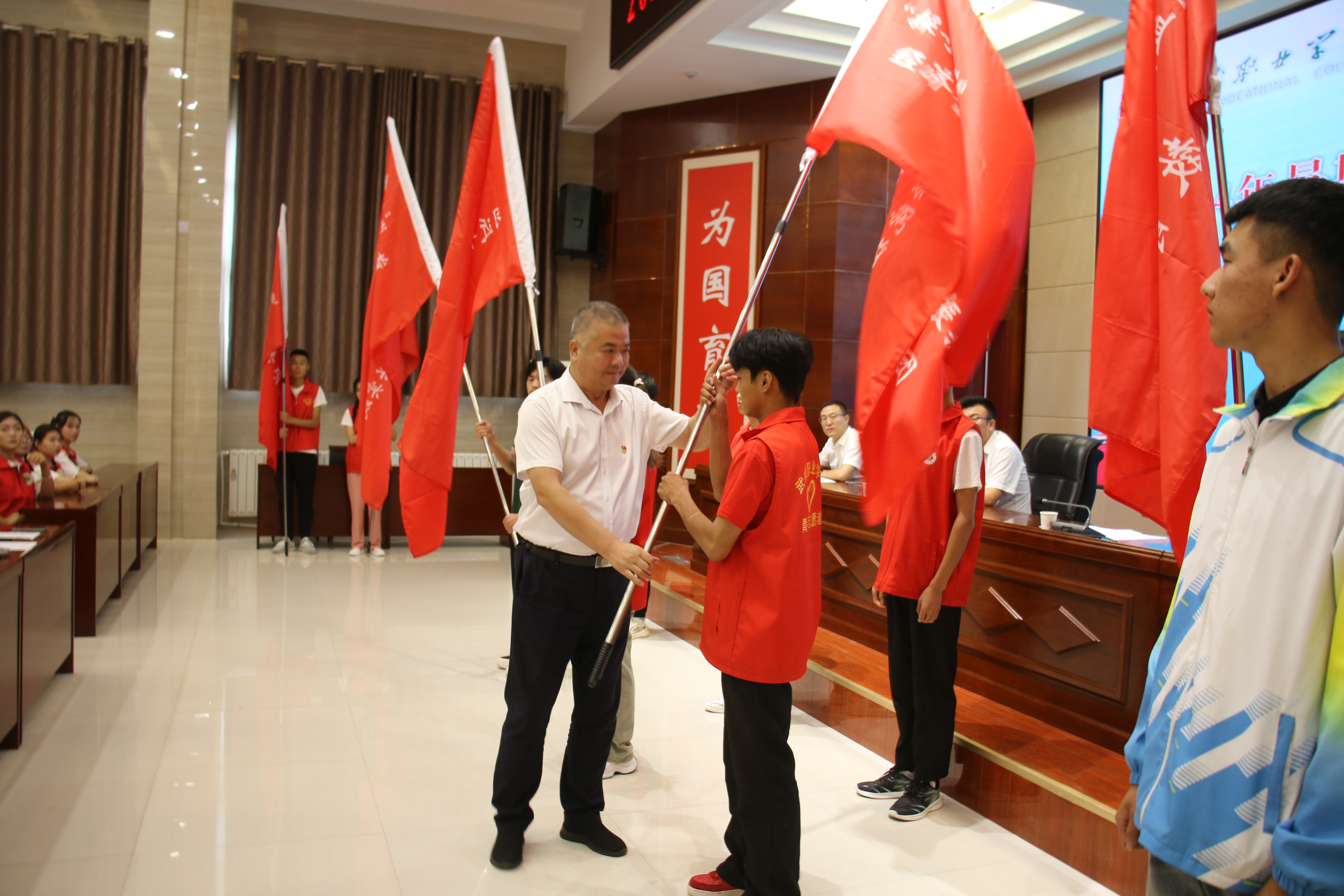 王守云為國(guó)家級(jí)和省級(jí)重點(diǎn)立項(xiàng)團(tuán)隊(duì)授旗,并對(duì)即將啟程的實(shí)踐團(tuán)隊(duì)提出三點(diǎn)希望和要求:一是要緊扣活動(dòng)主題,在學(xué)思踐悟中筑牢信仰根基;二是積極探索實(shí)踐,在篤行實(shí)干中練就過硬本領(lǐng);三是主動(dòng)擔(dān)當(dāng)作為,在踔厲奮發(fā)中展示武職風(fēng)采。希望同學(xué)們向下扎根、向上生長(zhǎng),鍛煉自我的同時(shí),筑牢“安全防線”,高質(zhì)量開展本次社會(huì)實(shí)踐活動(dòng),收獲成長(zhǎng)與進(jìn)步,將“三下鄉(xiāng)”活動(dòng)打造為我校形象展示的重要窗口和靚麗名片。