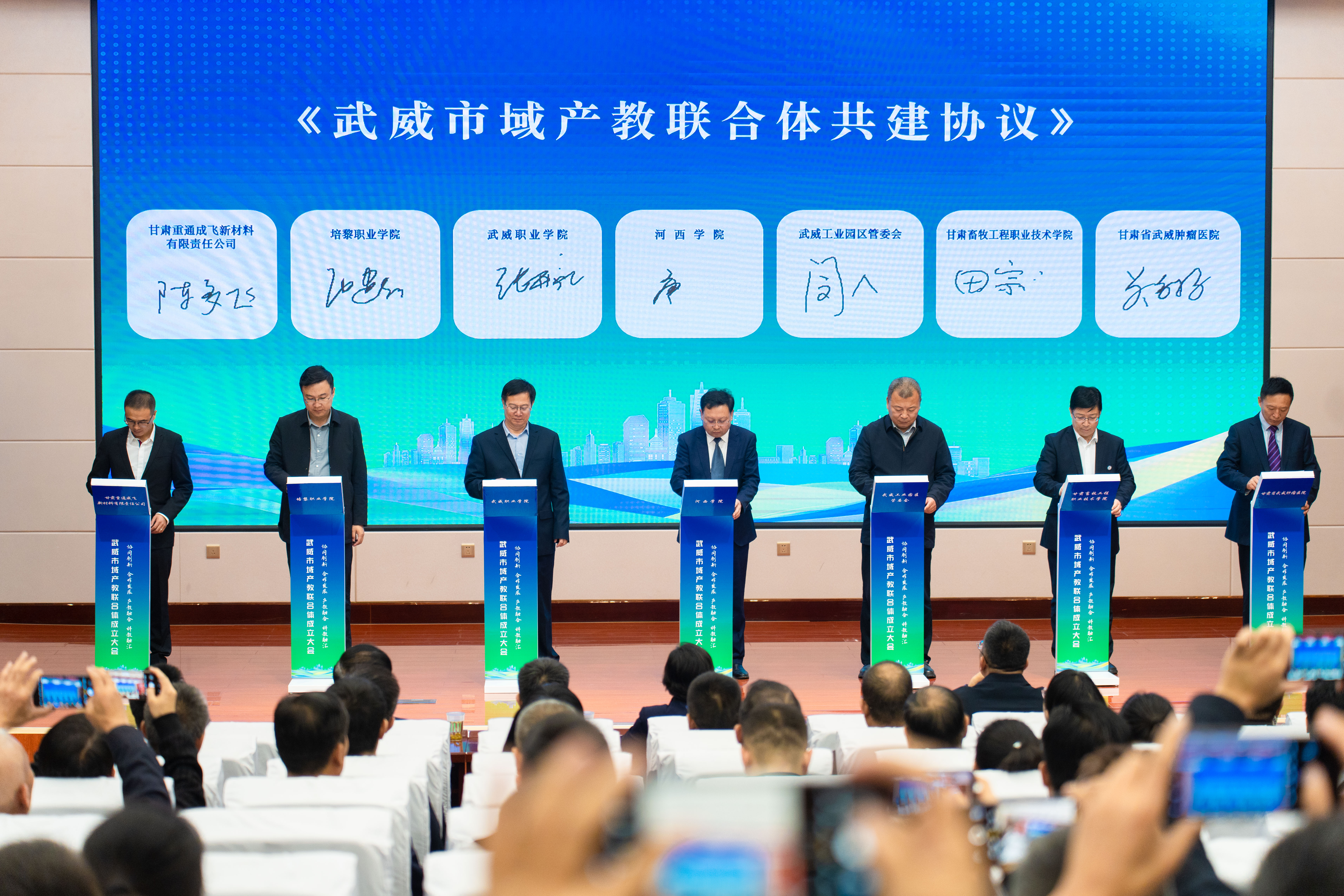 黨委書記王宏代表學(xué)校作為常務(wù)副理事長單位在大會(huì)上致辭,校長、黨委副書記張開禮與聯(lián)合體單位代表共同簽署《武威市域產(chǎn)教聯(lián)合體共建協(xié)議》。