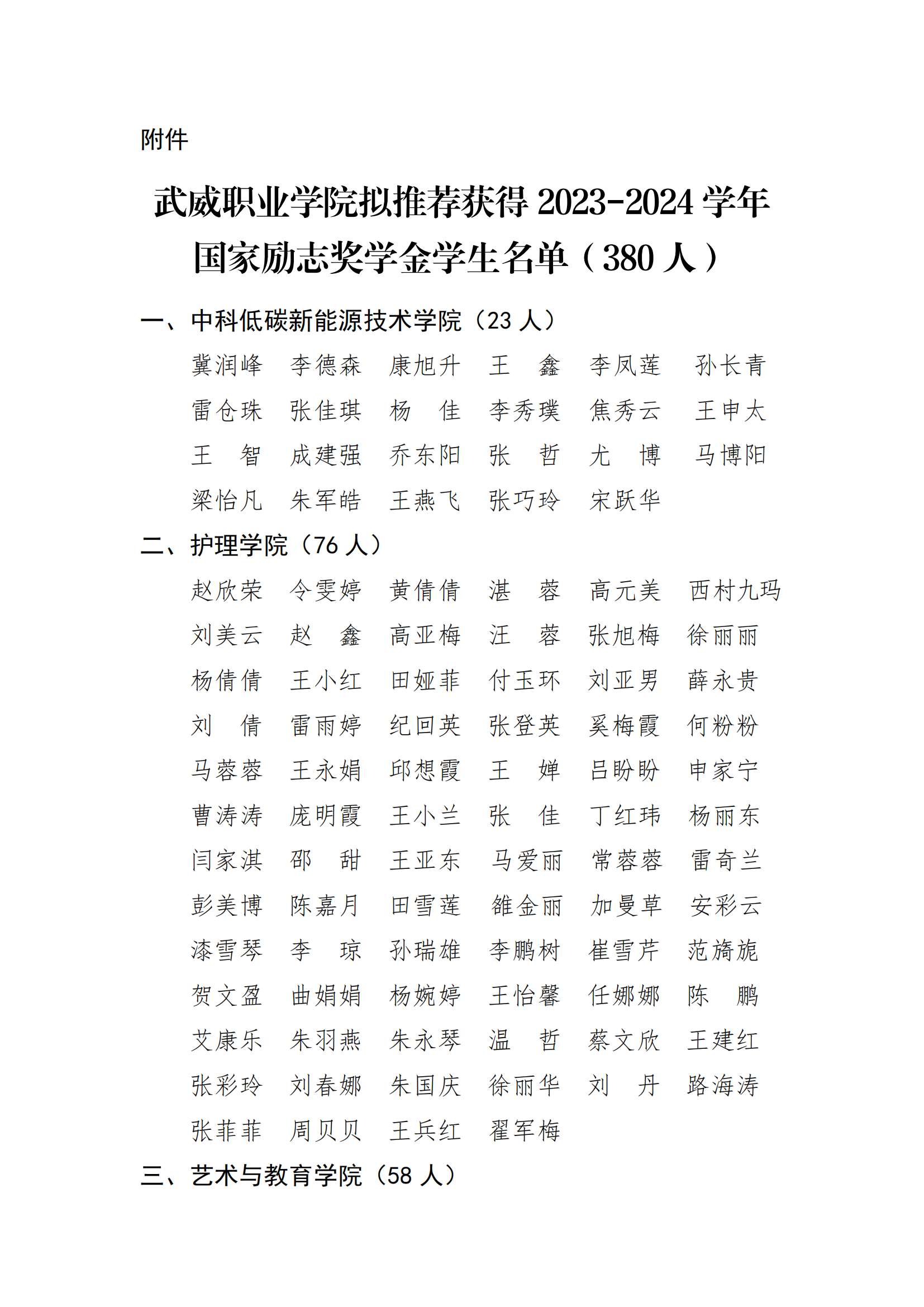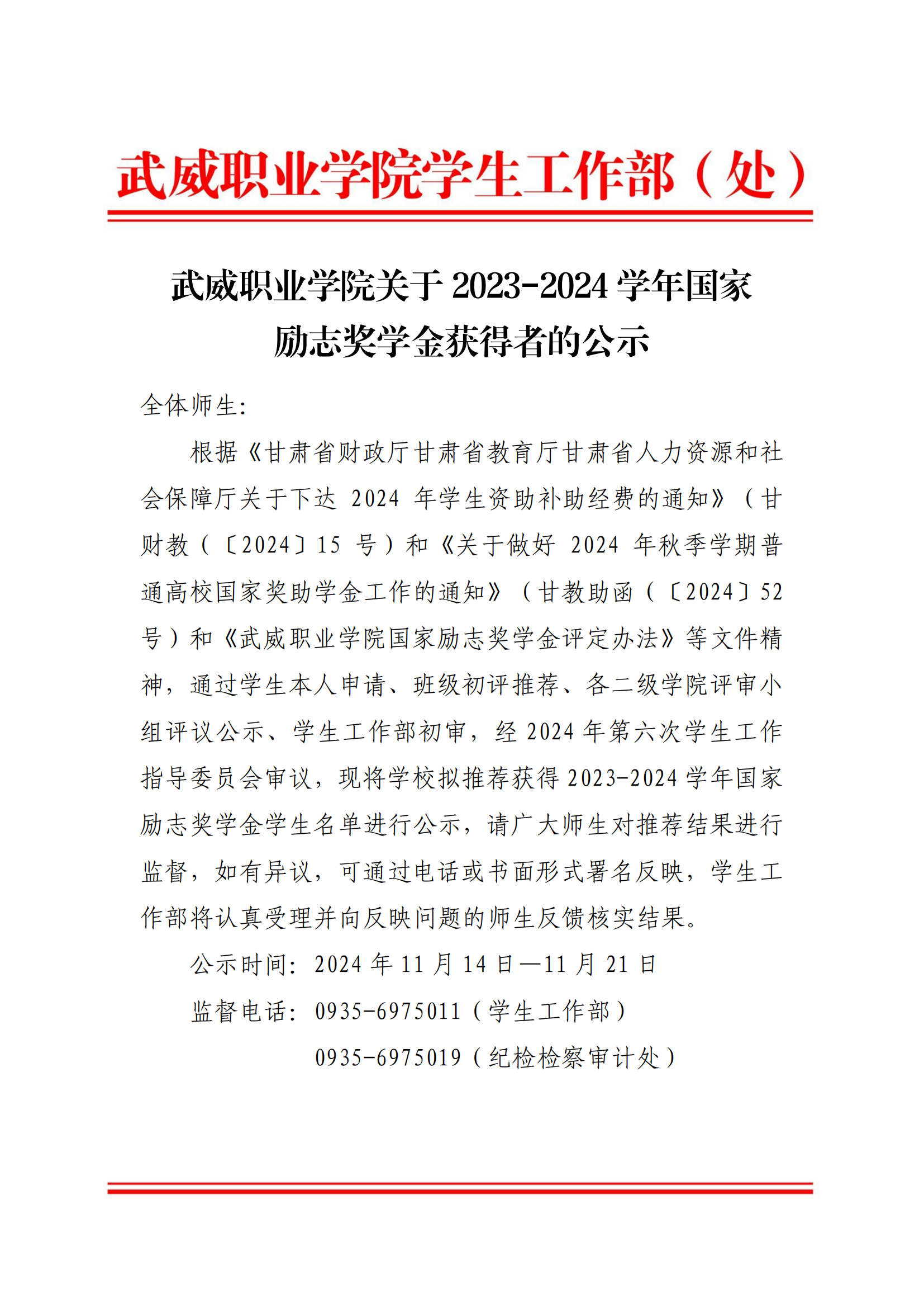 武威職業(yè)學(xué)院關(guān)于2023-2024學(xué)年國家勵(lì)志獎(jiǎng)學(xué)金候選人的公示