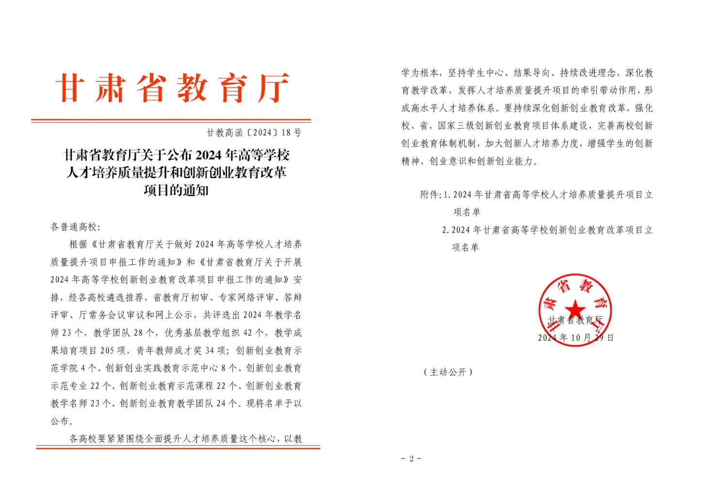 近日,甘肅省教育廳下發(fā)《關于公布2024年高等學校人才培養(yǎng)質量提升和創(chuàng)新創(chuàng)業(yè)教育改革項目的通知》(甘教高函〔2024〕18 號),藥學院申報的藥學專業(yè)獲批創(chuàng)新創(chuàng)業(yè)教育示范專業(yè)。