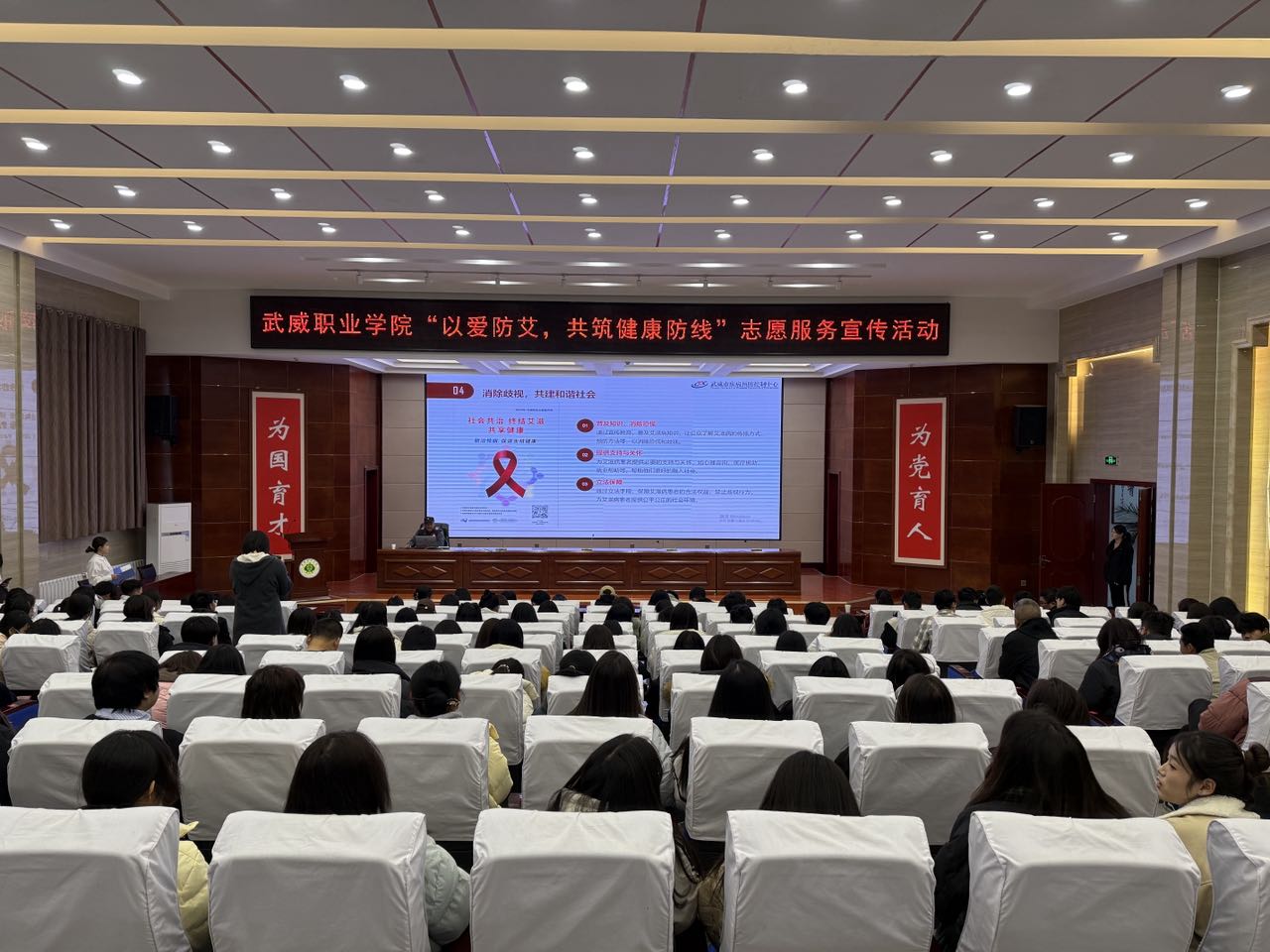 12月1日是第37個(gè)“世界艾滋病日”。為普及艾滋病防治知識(shí),進(jìn)一步增強(qiáng)廣大青年學(xué)子的自我防護(hù)意識(shí)與能力,促進(jìn)身心健康發(fā)展,12月1日下午,校團(tuán)委聯(lián)合護(hù)理學(xué)院邀請(qǐng)武威市疾控中心在學(xué)校菁英廳開(kāi)展主題為“以愛(ài)防艾,共筑健康防線”主題宣傳活動(dòng),吸引了200余名師生積極參與。