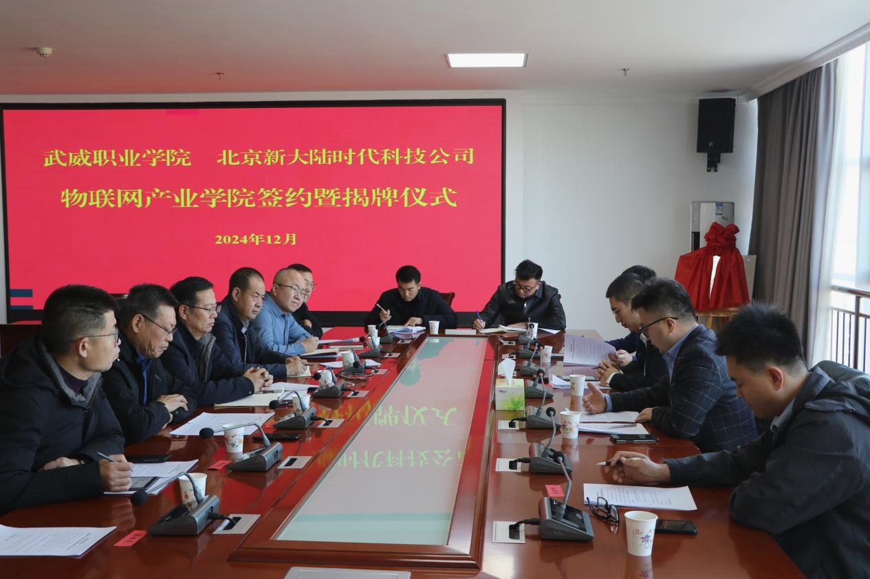 為全面深化產(chǎn)教融合,加強(qiáng)校企合作,進(jìn)一步提高我校人才培養(yǎng)質(zhì)量。12月3日,學(xué)校在能源科技樓811會(huì)議室舉行武威職業(yè)學(xué)院和北京新大陸時(shí)代科技公司物聯(lián)網(wǎng)產(chǎn)業(yè)學(xué)院簽約暨揭牌儀式。北京新大陸時(shí)代科技公司西北區(qū)總監(jiān)劉寧、技術(shù)總監(jiān)樊斌,相關(guān)業(yè)務(wù)部門負(fù)責(zé)人,學(xué)校校長(zhǎng)、黨委副書記張開禮、黨委副書記翟存祥、相關(guān)部門負(fù)責(zé)人及教師代表參加活動(dòng)。黨委委員、副校長(zhǎng)王永緒主持儀式。