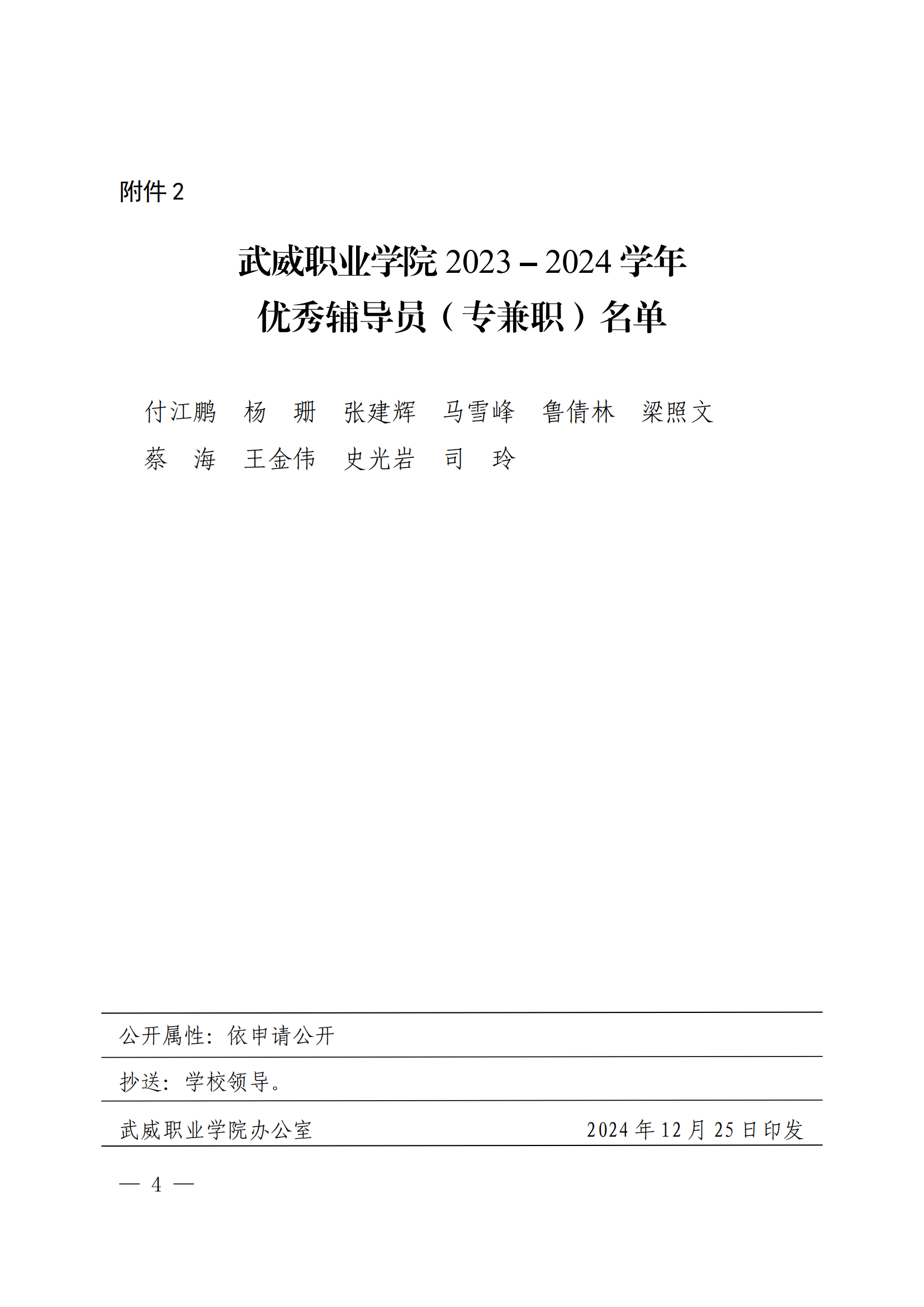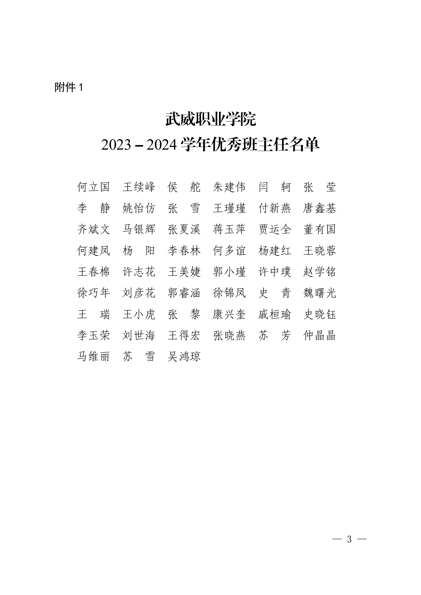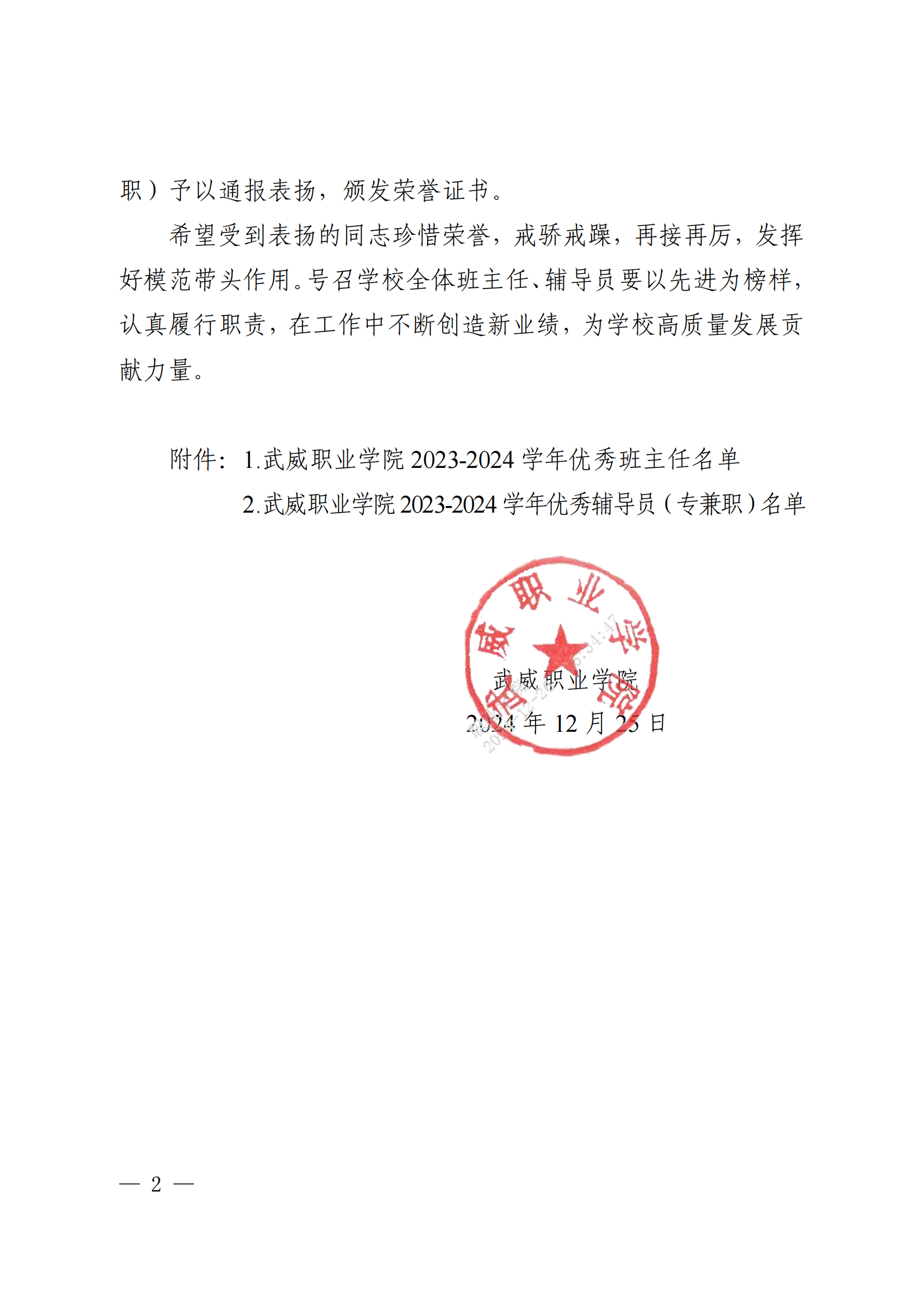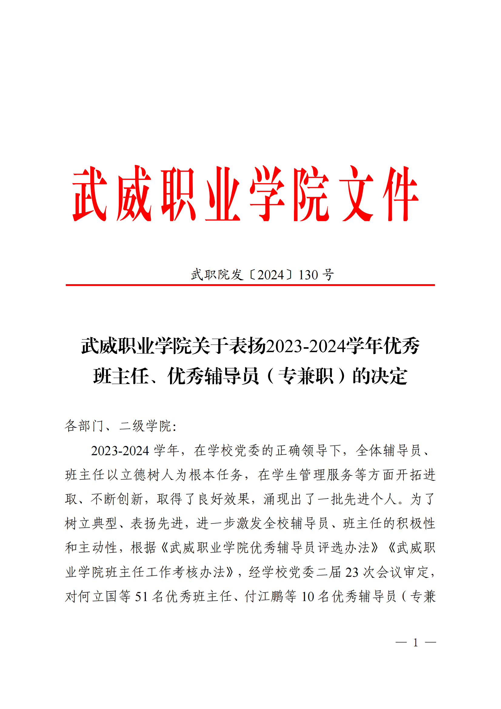 武威職業(yè)學院關(guān)于表揚2023-2024學年優(yōu)秀班主任、優(yōu)秀輔導(dǎo)員(專兼職)的決定