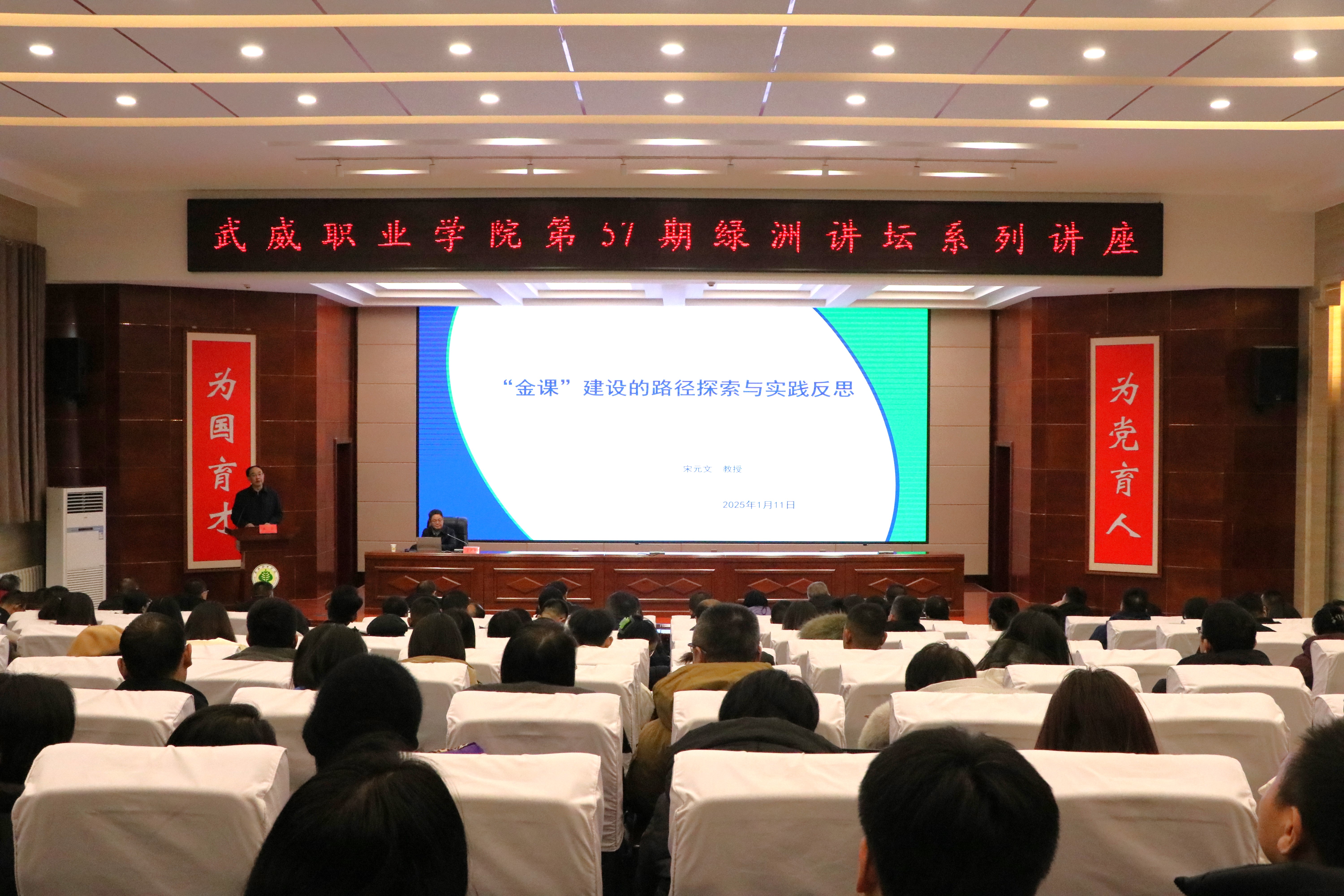 1月11日下午,學(xué)校特邀原蘭州資源環(huán)境職業(yè)技術(shù)大學(xué)副校長宋元文教授在菁英廳作了《“金課”建設(shè)的實踐反思與路徑探索》主題講座。講座由學(xué)校黨委書記王宏主持,學(xué)校領(lǐng)導(dǎo)、中層管理干部、教研室主任及教師代表共210余人參加。