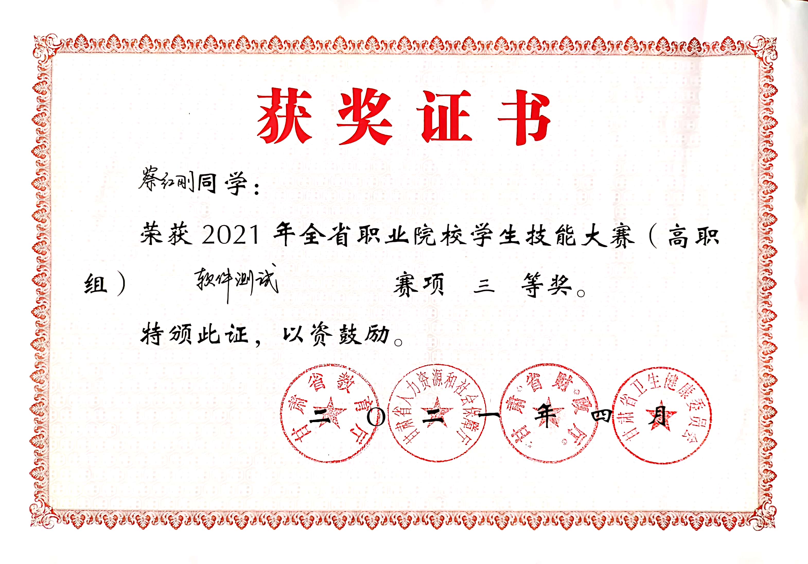 學生獲2021年全省職業(yè)院校學生技能大賽軟件測試三等獎