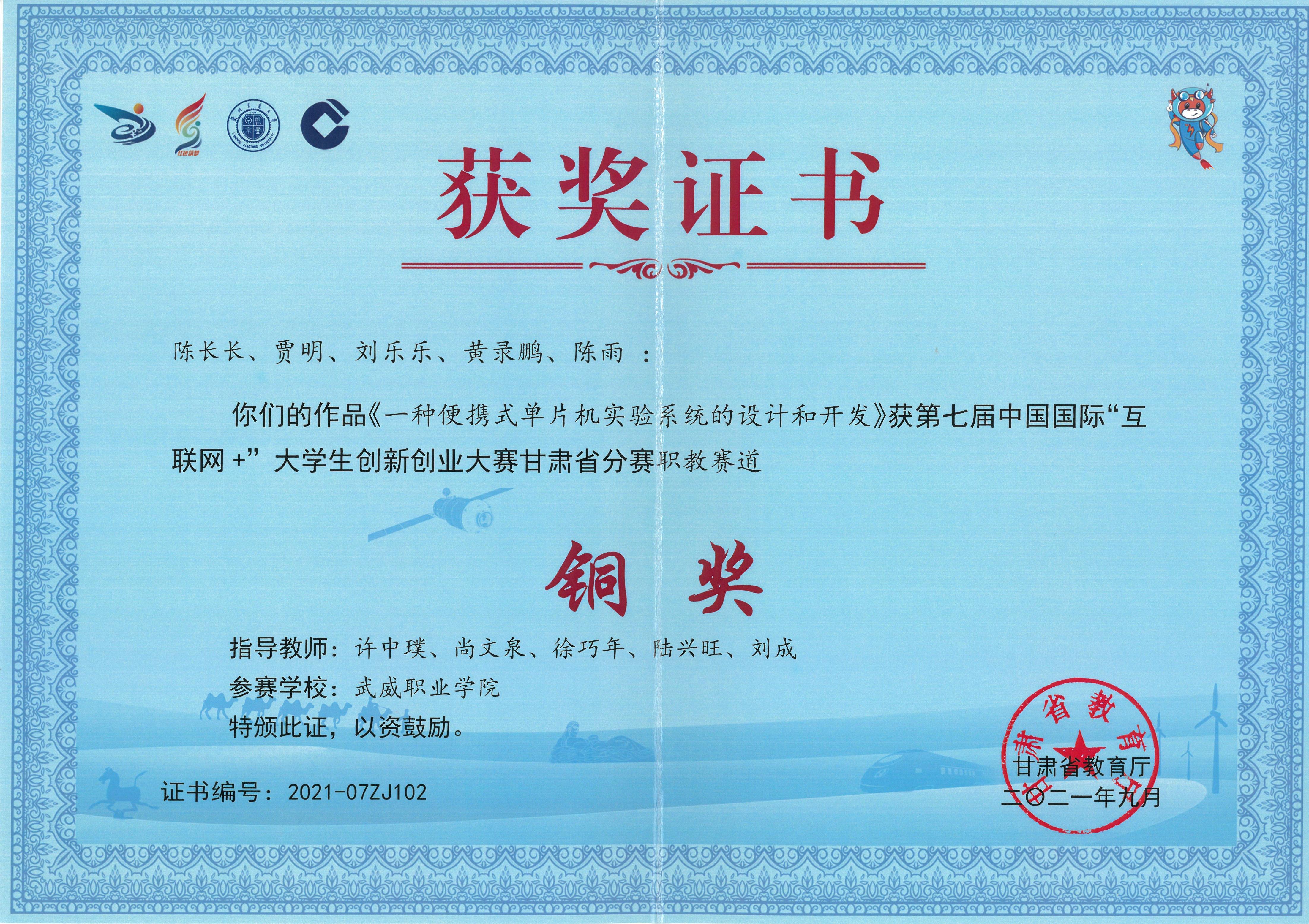 2021年學(xué)生獲第七屆中國(guó)國(guó)際“互聯(lián)網(wǎng)+”大學(xué)生創(chuàng)新創(chuàng)業(yè)大賽甘肅賽區(qū)銅獎(jiǎng)