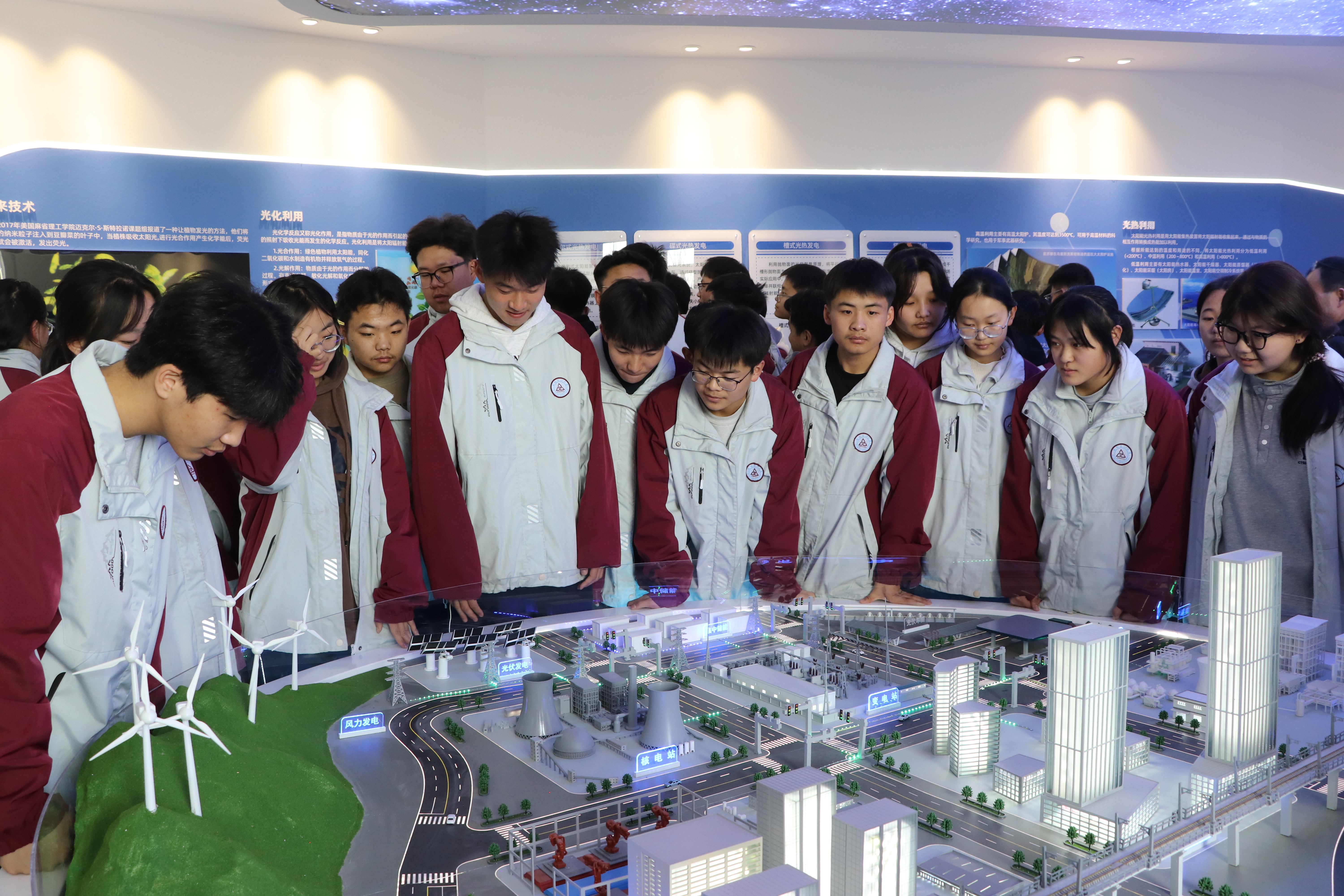 參觀活動中,同學(xué)們興致勃勃的在“新能源科技館”中探索新能源的奧秘,體驗參觀了光伏發(fā)電應(yīng)用、核能應(yīng)用、風(fēng)能應(yīng)用、氫能應(yīng)用等并觀看了多能互補沙盤演示。同學(xué)們在活動中觸摸科技,感受科技的無窮魅力,從而在心田播下科技之種,放飛科技成才夢想。