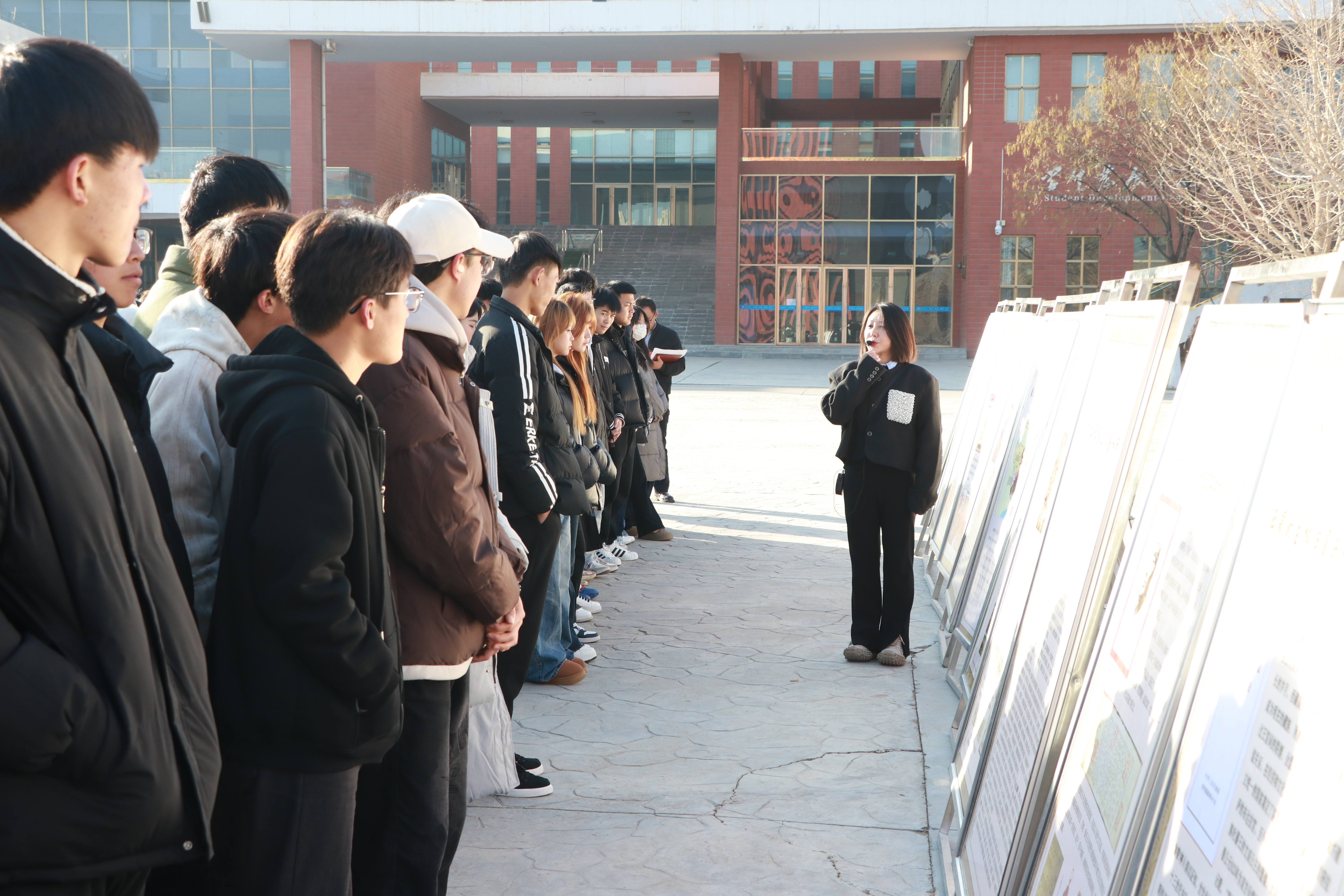 在學生發(fā)展中心前廣場,同學們現(xiàn)場參觀了民族文化宣傳展板,二十余塊展板圖文并茂生動展現(xiàn)了涼州會盟的歷史背景和意義,展示了新時代武威市在民族團結進步方面的壯闊歷程和取得的豐碩成果。武威市涼州會盟紀念館講解員楊琪以涼州會盟歷史為線,現(xiàn)場向大家講解了民族團結故事。