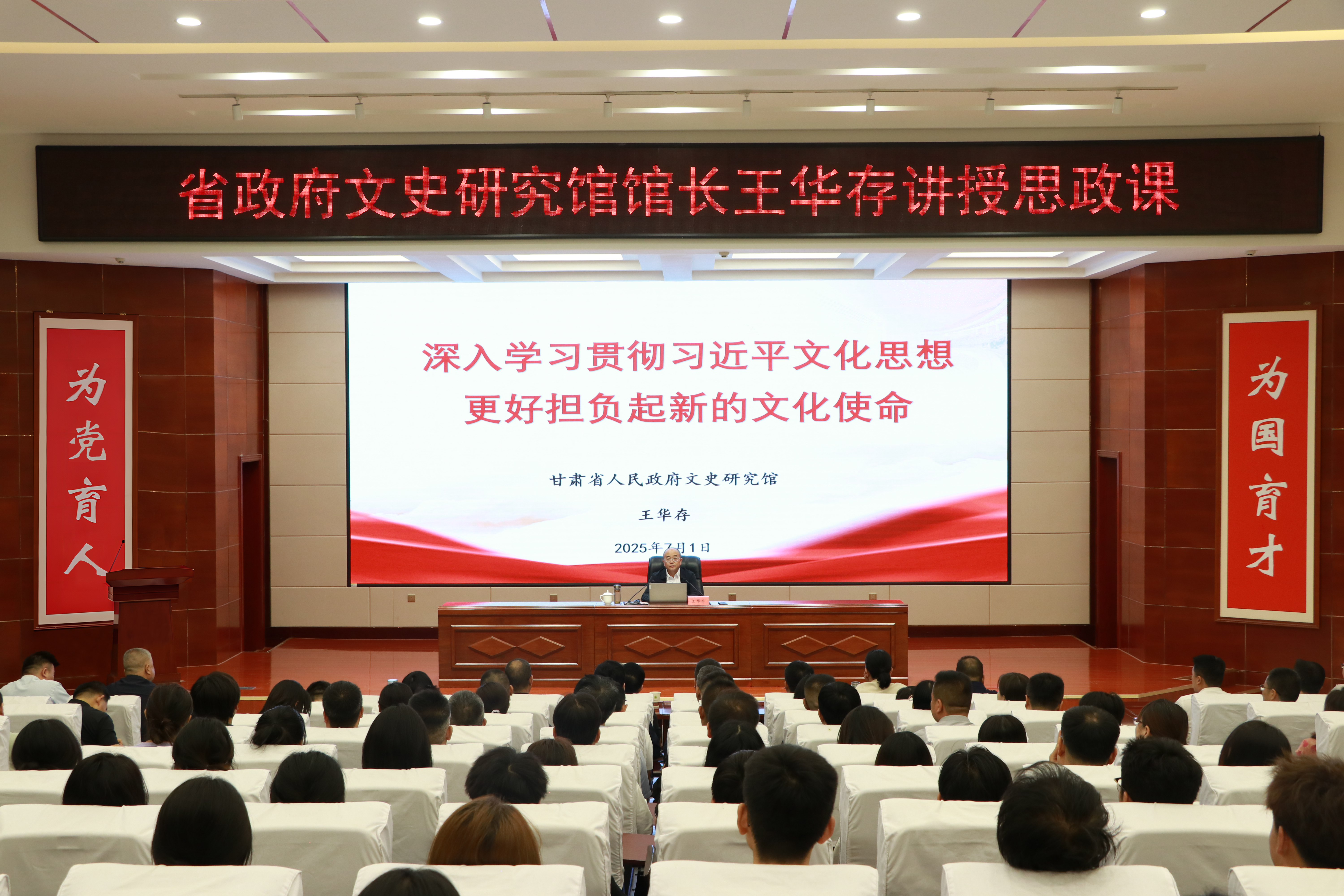 7月1日,在全校上下喜迎中國(guó)共產(chǎn)黨成立104周年之際,甘肅省人民政府文史研究館黨組書記、館長(zhǎng)王華存到學(xué)校為師生講授思想政治理論課。王華存以“深入學(xué)習(xí)貫徹習(xí)近平文化思想 更好擔(dān)負(fù)起新的文化使命”為題,從深刻認(rèn)識(shí)習(xí)近平文化思想的形成過程、習(xí)近平文化思想的豐富內(nèi)涵和核心要義、甘肅文化歷史簡(jiǎn)述、當(dāng)代青年如何更好擔(dān)當(dāng)起新的文化使命四個(gè)方面對(duì)習(xí)近平文化思想進(jìn)行了全面解讀。黨委書記王宏主持,學(xué)校領(lǐng)導(dǎo)、中層管理干部及師生代表共200余人到場(chǎng)聆聽。