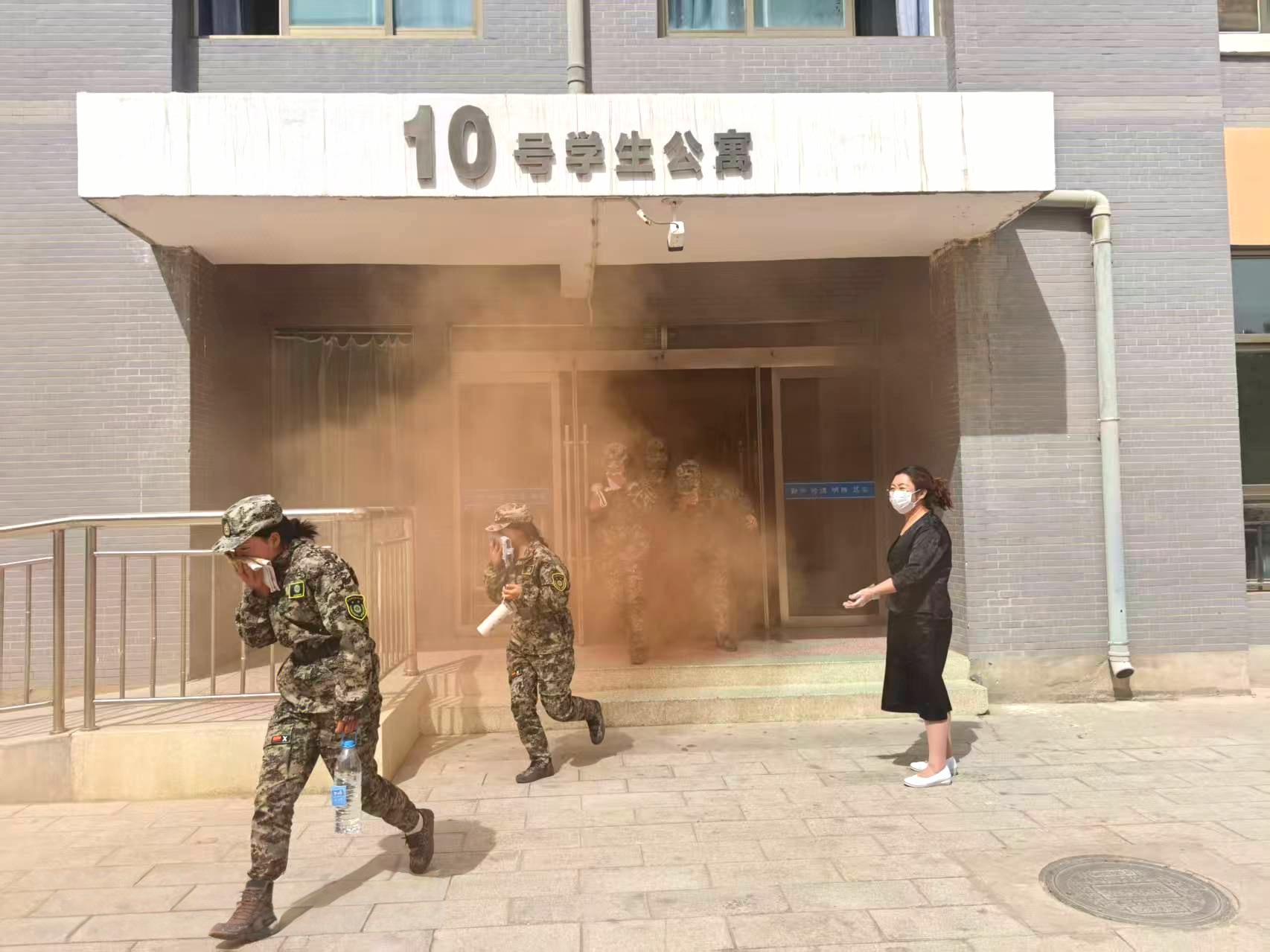 14時30分,疏散演練正式開始。隨著火災警報響起,安全保衛(wèi)工作人員點燃煙餅,在學生公寓樓模擬火災現(xiàn)場,冒出滾滾濃煙,公寓管理人員迅速組織學生有序疏散。在輔導員、班主任的引導下,同學們按照疏散要領和疏散路線,快速、有序地撤離至體育場。