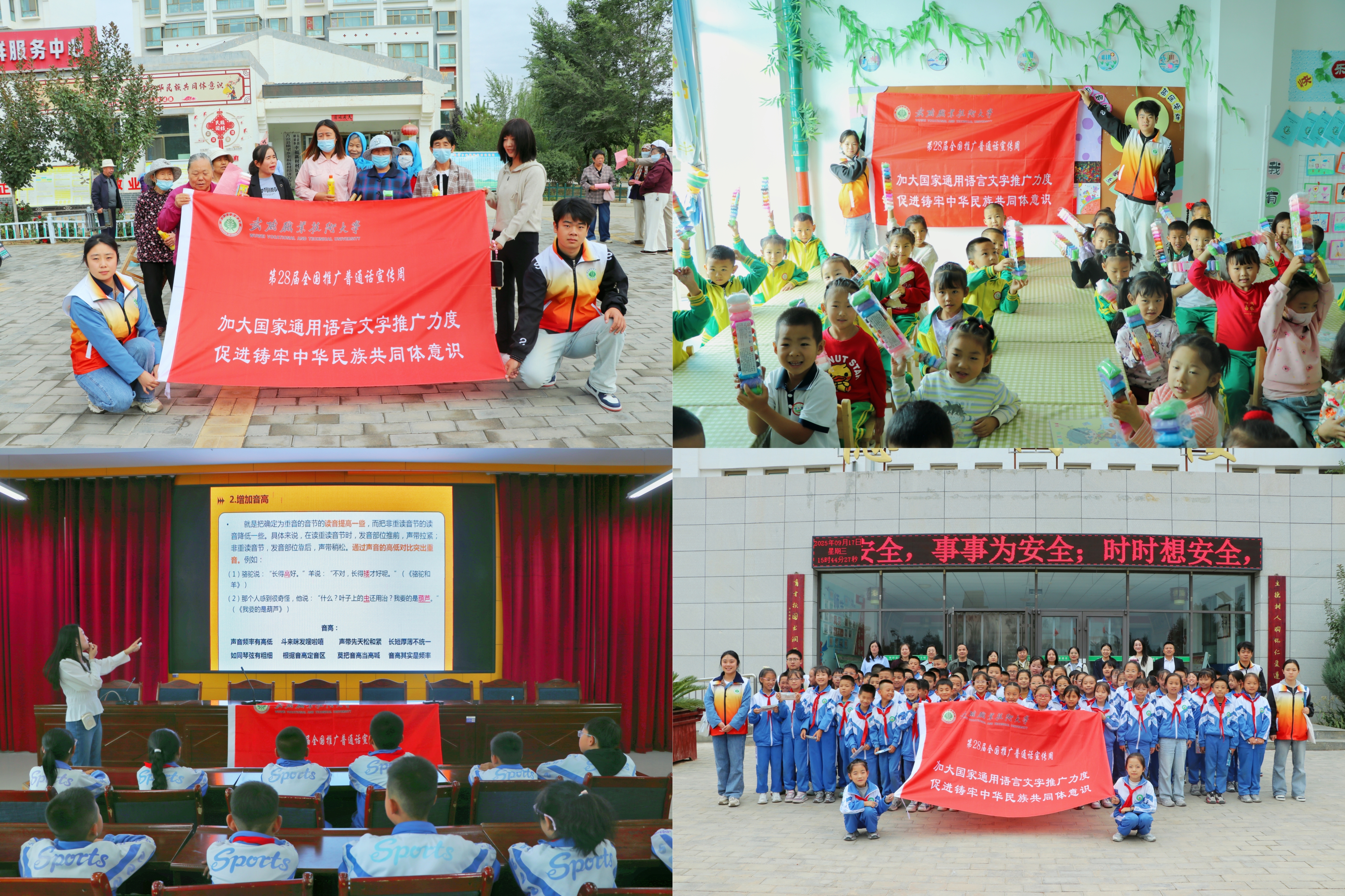 9月17日,武威職業(yè)技術(shù)大學(xué)推普志愿服務(wù)隊一行赴古浪縣綠洲小鎮(zhèn)幸福新村、康寧新村、綠洲完全小學(xué)及綠洲幼兒園,開展以“加大國家通用語言文字推廣力度,促進鑄牢中華民族共同體意識”為主題的國家通用語言文字推廣活動,以實際行動助力鄉(xiāng)村振興。