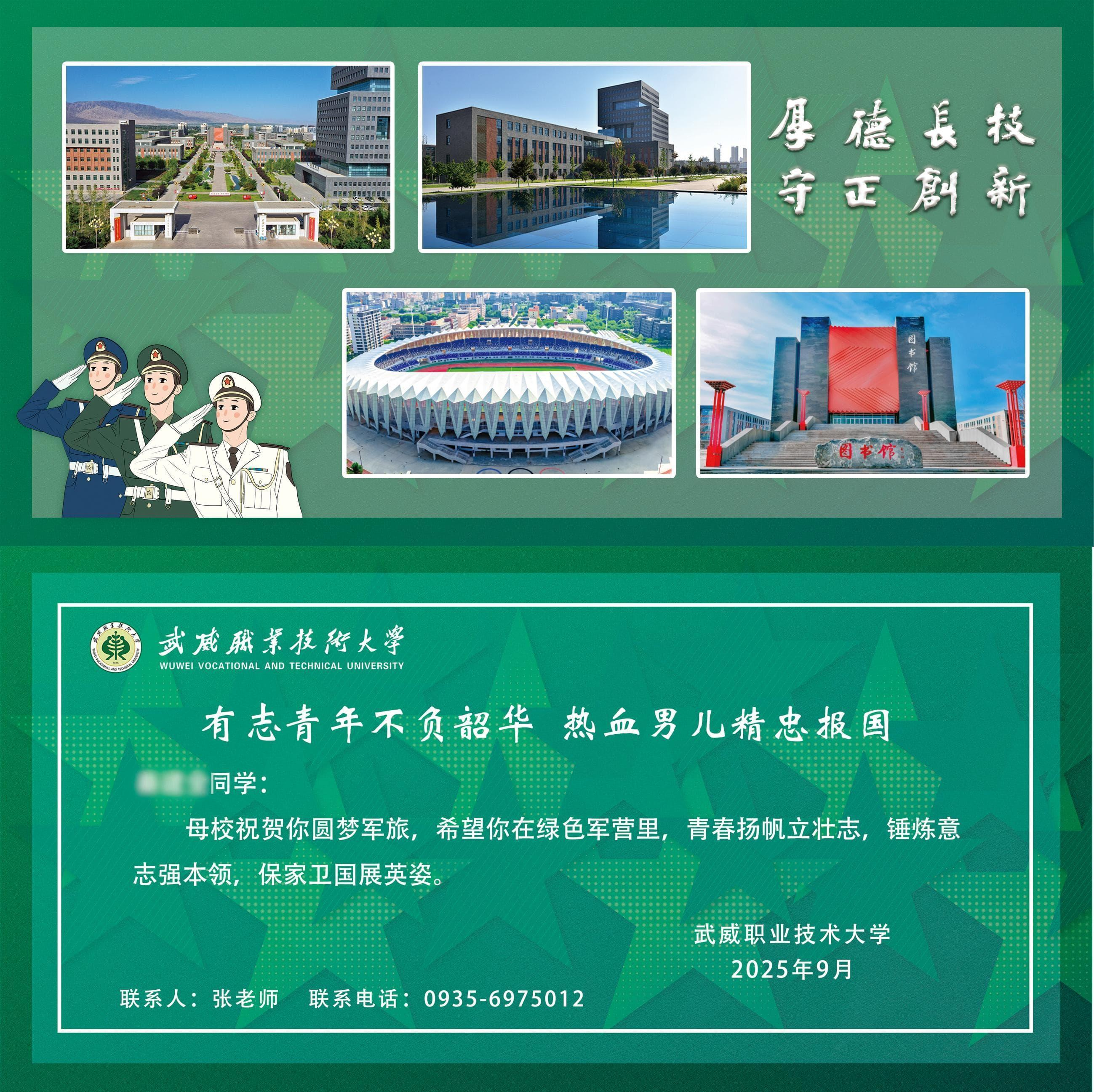 從戎報(bào)國(guó)英雄志,建功立業(yè)正當(dāng)時(shí)。經(jīng)歷嚴(yán)謹(jǐn)?shù)捏w檢篩選、政治審查,以及役前集訓(xùn)的磨礪淬煉,武威職業(yè)技術(shù)大學(xué)19名有志青年身披戎裝,即將離開(kāi)母校進(jìn)入軍營(yíng),奔赴國(guó)防一線(xiàn),以青春之名赴山河之約,用熱血擔(dān)當(dāng)書(shū)寫(xiě)保家衛(wèi)國(guó)的嶄新篇章。9月15日,學(xué)生工作部(征兵工作站)工作人員和各二級(jí)學(xué)院輔導(dǎo)員、班主任代表前往武威市役前教育訓(xùn)練基地對(duì)參軍學(xué)生進(jìn)行慰問(wèn),為他們送行。