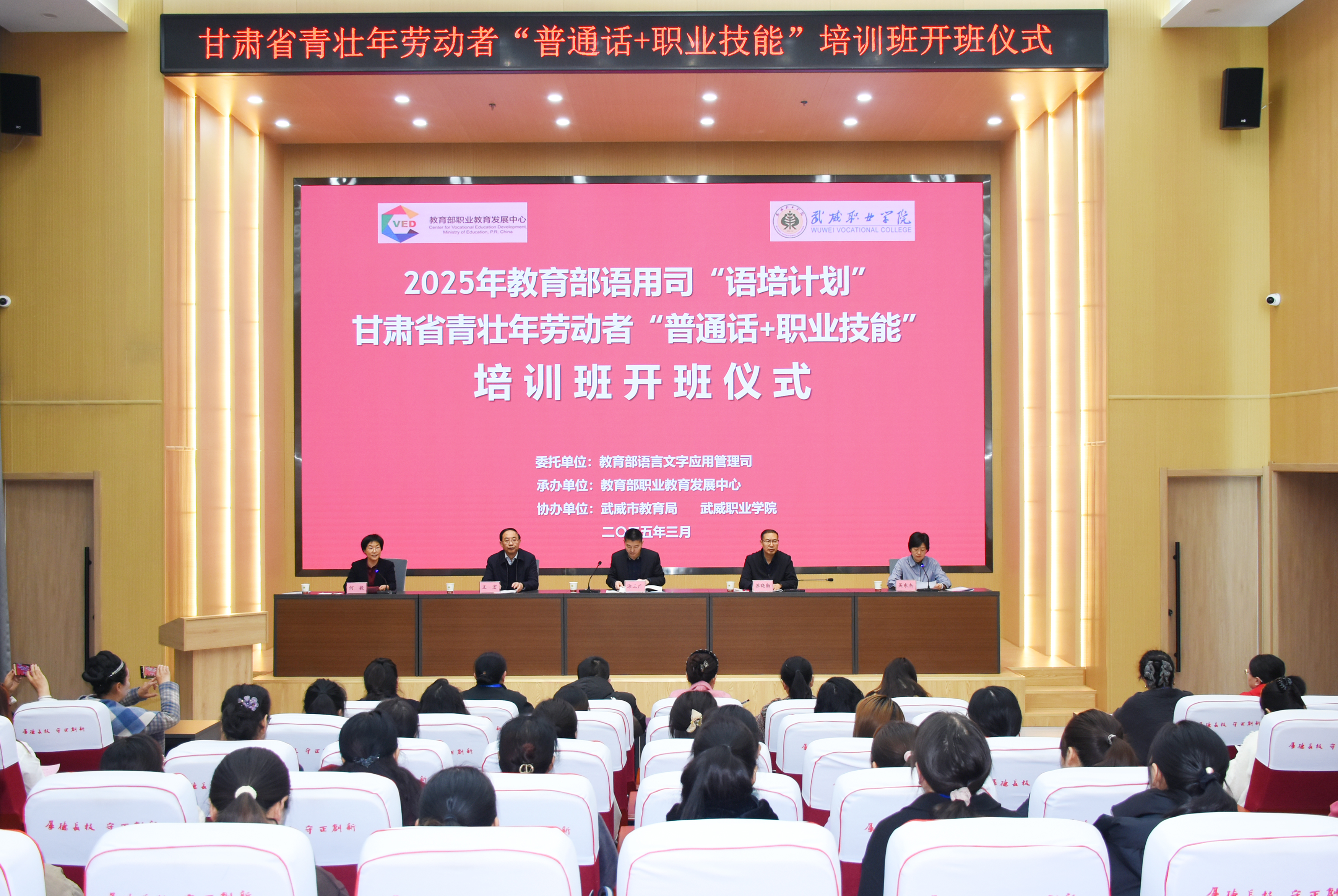 3月25日,教育部語(yǔ)用司“語(yǔ)培計(jì)劃”甘肅省青壯年勞動(dòng)者“普通話+職業(yè)技能”培訓(xùn)班在學(xué)校成功開(kāi)班。本次培訓(xùn)由教育部語(yǔ)用司主辦,教育部職業(yè)教育發(fā)展中心承辦,武威市教育局和學(xué)校協(xié)辦。本次培訓(xùn)是深入貫徹落實(shí)黨的二十大和二十屆二中、三中全會(huì)精神,落實(shí)全國(guó)教育大會(huì)精神,實(shí)施《教育強(qiáng)國(guó)建設(shè)規(guī)劃綱要(2024-2035年)》的重要舉措,旨在進(jìn)一步推廣國(guó)家通用語(yǔ)言文字的應(yīng)用,促進(jìn)鑄牢中華民族共同體意識(shí)。
