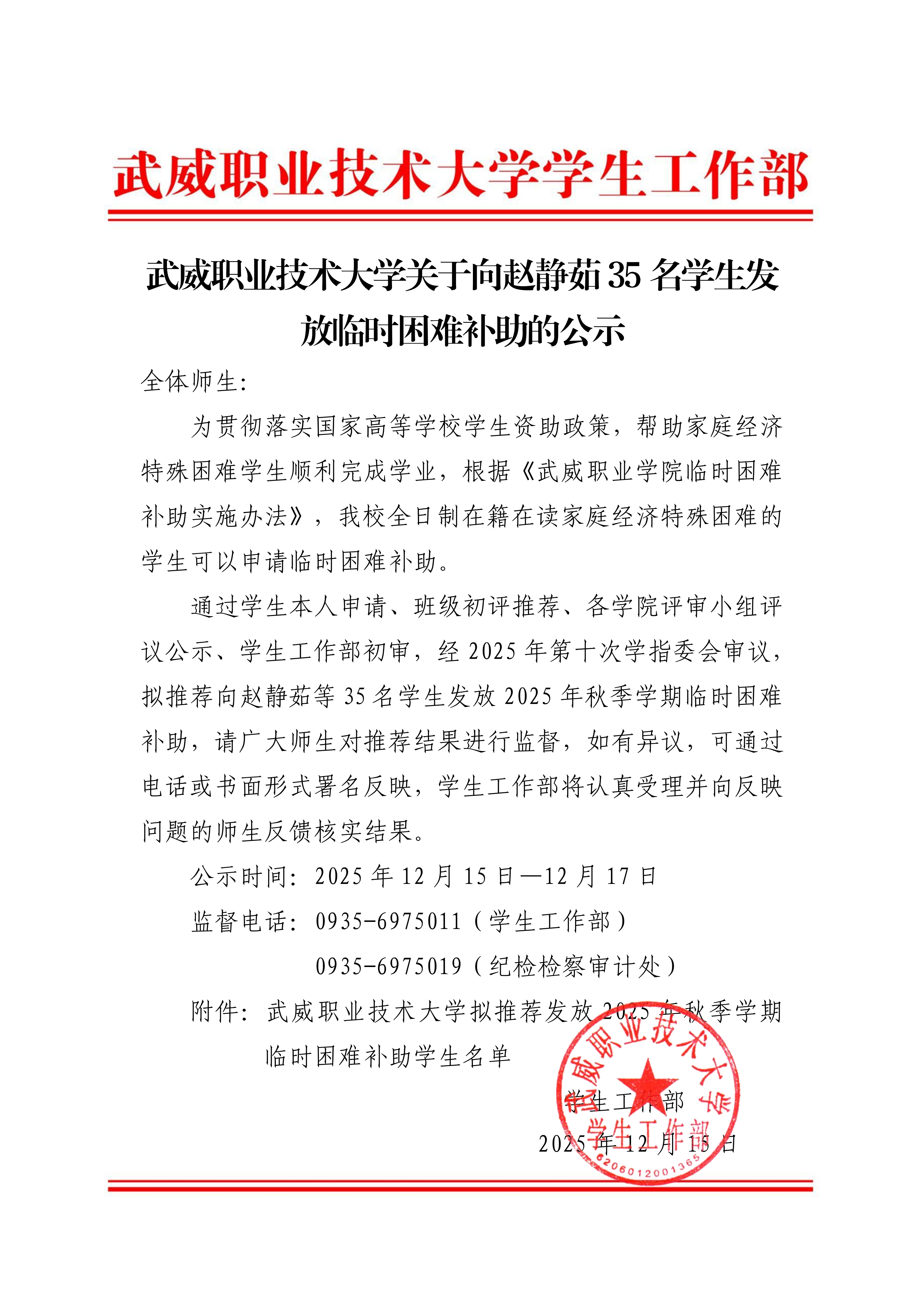 武威職業(yè)技術(shù)大學關(guān)于向趙靜茹35名學生發(fā)放臨時困難補助的公示