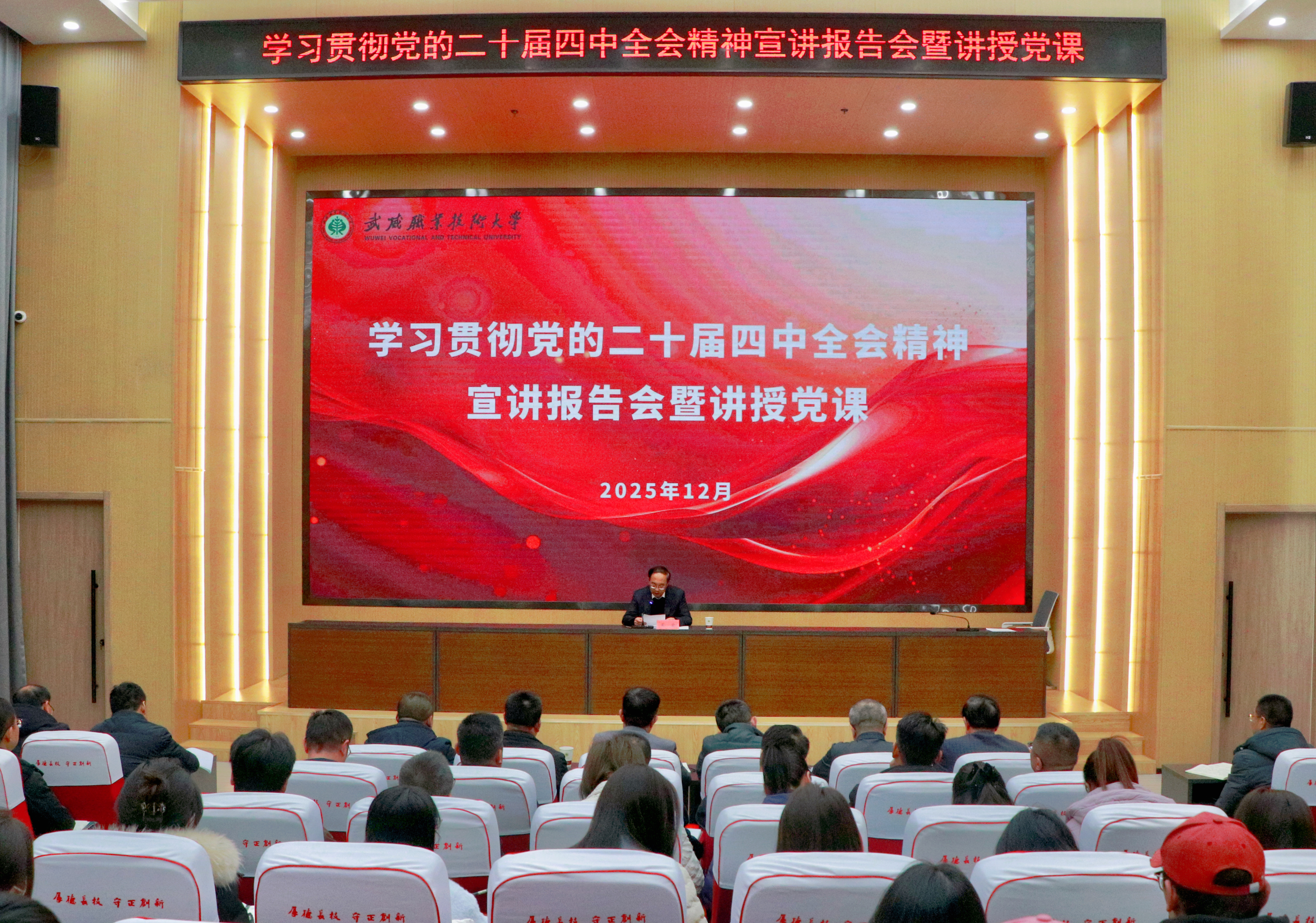 12月10日,黨委書記王宏專題宣講黨的二十屆四中全會精神,并向師生講授黨課。他強調(diào),要深入學(xué)習(xí)貫徹黨的二十屆四中全會精神,全面把握核心要義,立足職業(yè)本科教育新起點,奮力譜寫學(xué)校高質(zhì)量發(fā)展新篇章,為加快推進中國式現(xiàn)代化武威實踐貢獻智慧力量。黨委副書記、副校長張開禮主持報告會。