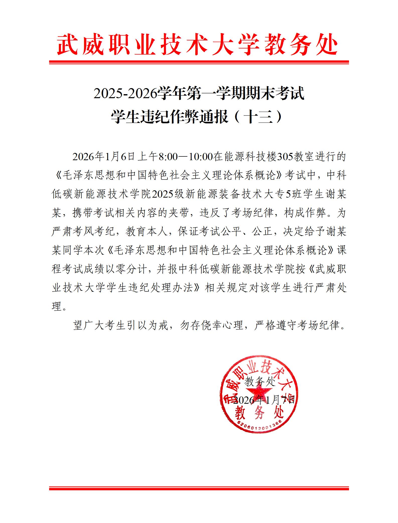 2025-2026學(xué)年第一學(xué)期期末考試學(xué)生違紀(jì)作弊通報(十三)