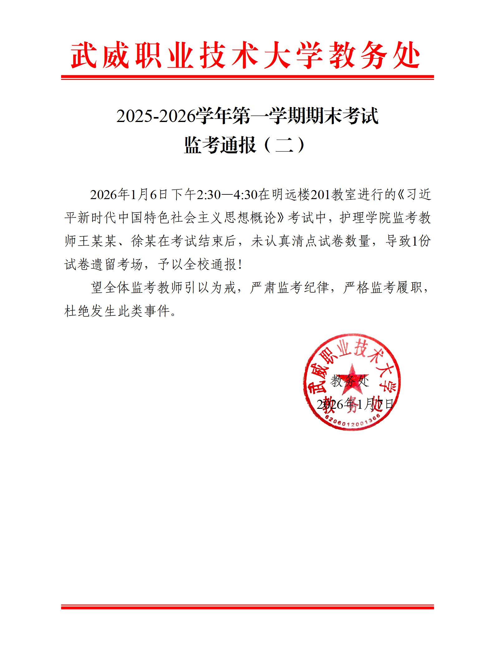 2025-2026學年第一學期期末考試監(jiān)考通報(二)