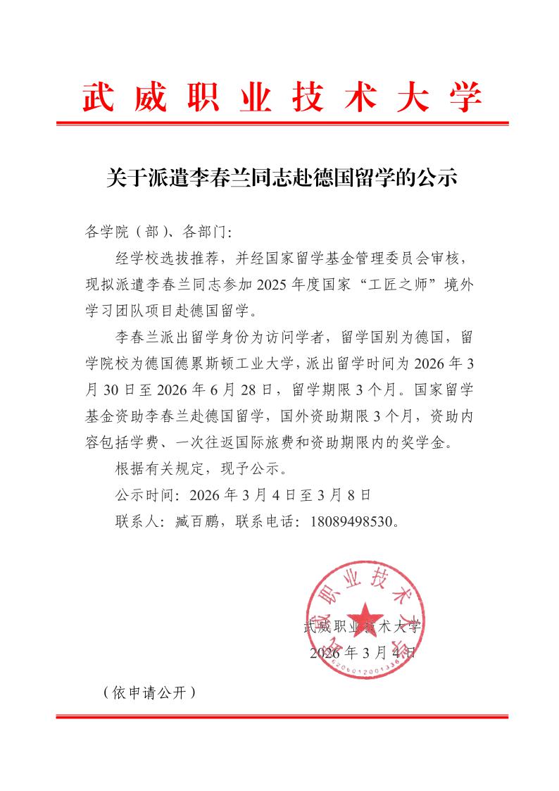 關(guān)于派遣李春蘭同志赴德國留學的公示