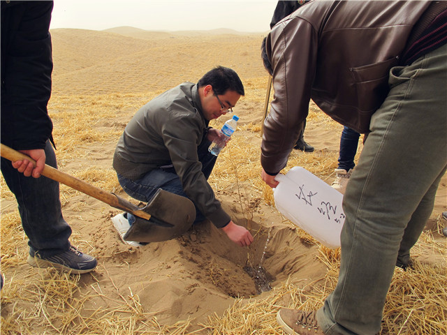 到達(dá)治沙造林現(xiàn)場(chǎng)后,師生按照劃分好的區(qū)域,帶上塑料桶,拿上土鉆,馬上投入到了緊張的勞動(dòng)中。在現(xiàn)場(chǎng)技術(shù)人員的指導(dǎo)下挖坑、栽種樹(shù)苗、澆水,完成了預(yù)定的治沙造林任務(wù)。