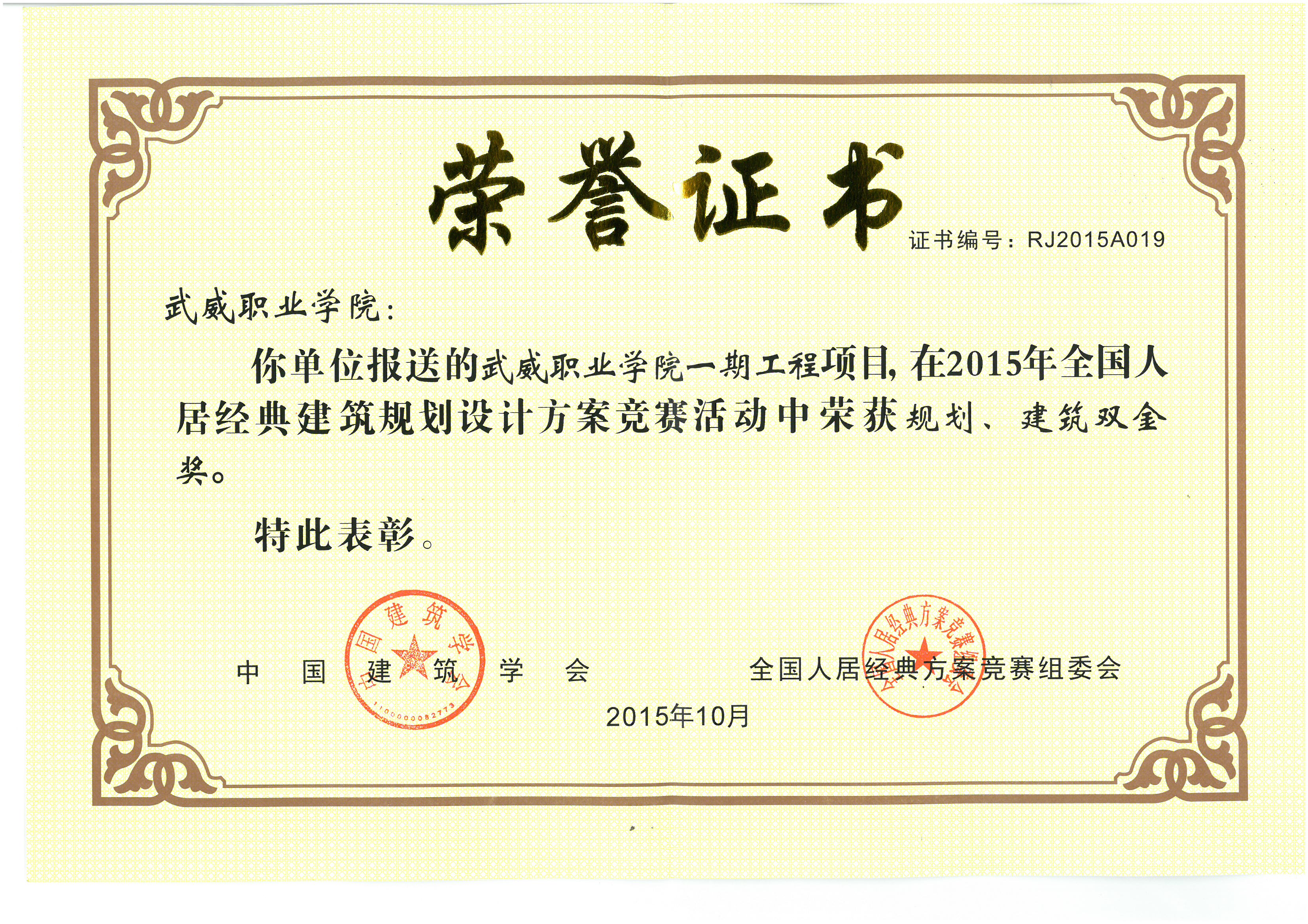 2015年10月,第十五屆全國人居經(jīng)典建筑規(guī)劃設(shè)計方案競賽結(jié)果在北京揭曉,我院報送的武威職業(yè)學(xué)院一期擴(kuò)建項(xiàng)目在全國眾多參賽項(xiàng)目中脫穎而出,榮膺規(guī)劃、建筑雙金獎。全國人居經(jīng)典方案競賽由中國建筑學(xué)會主辦,全國人居經(jīng)典方案競賽組委會承辦,自2001年起每年舉辦一屆,參賽項(xiàng)目覆蓋全國所有省份及港澳臺地區(qū),評審專家皆為業(yè)界權(quán)威,獲獎難度大,權(quán)威性高。榮膺規(guī)劃、建筑雙金獎是武威建筑項(xiàng)目上的首次。