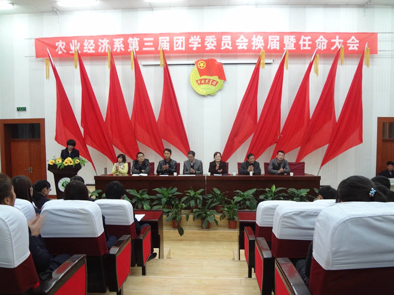 蔡飛介紹了學生會在學生工作中所起作用并對新一屆學生會提出了期望。同時,宣布對農(nóng)業(yè)經(jīng)濟系第三屆團學干部的任命。大會由第二屆學生會主席吳光宗做第二屆團學會工作總結,新當選主席趙三桃代表新一屆團學會宣誓。會上還對優(yōu)秀團學干部進行表彰。