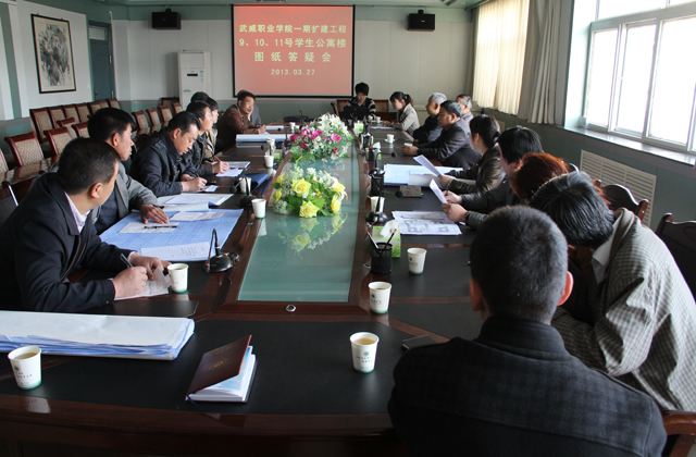 2013年3月27日上午,在二號教學(xué)樓會議室召開9、10、11號學(xué)生公寓樓圖紙答疑會。設(shè)計(jì)單位清華大學(xué)建筑設(shè)計(jì)研究院,施工投標(biāo)單位甘肅省第三建筑公司,甘肅省第四建筑公司,武威高壩建筑公司以及學(xué)院相關(guān)人員參加了會議。會議由副院長趙明主持。