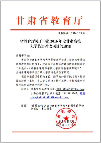 省教育廳關于申報2016年度甘肅高校大學英語教改項目的通知