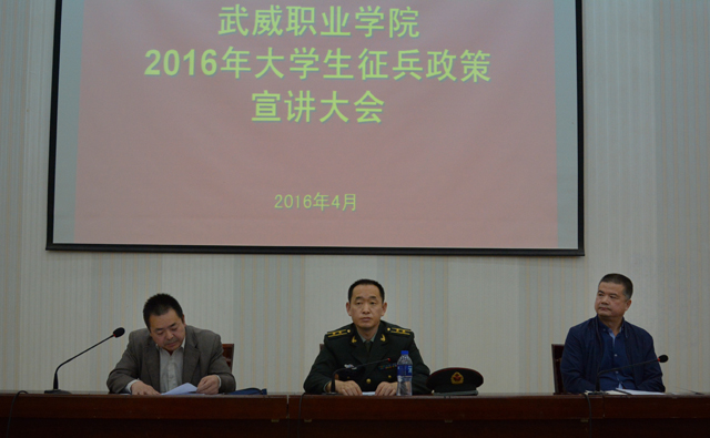 為支持國(guó)防建設(shè),鼓勵(lì)大學(xué)生參軍入伍保家衛(wèi)國(guó),學(xué)院于4月14日下午在尚德樓正德廳召開了2016年大學(xué)生應(yīng)征入伍政策宣講暨動(dòng)員大會(huì)。學(xué)生工作處負(fù)責(zé)人王守云主持會(huì)議,涼州區(qū)人民武裝部政治工作科科長(zhǎng)趙輝泉、涼州區(qū)西關(guān)街政法書記趙光慶到場(chǎng)宣講。學(xué)院280多名師生參加了宣講大會(huì)。