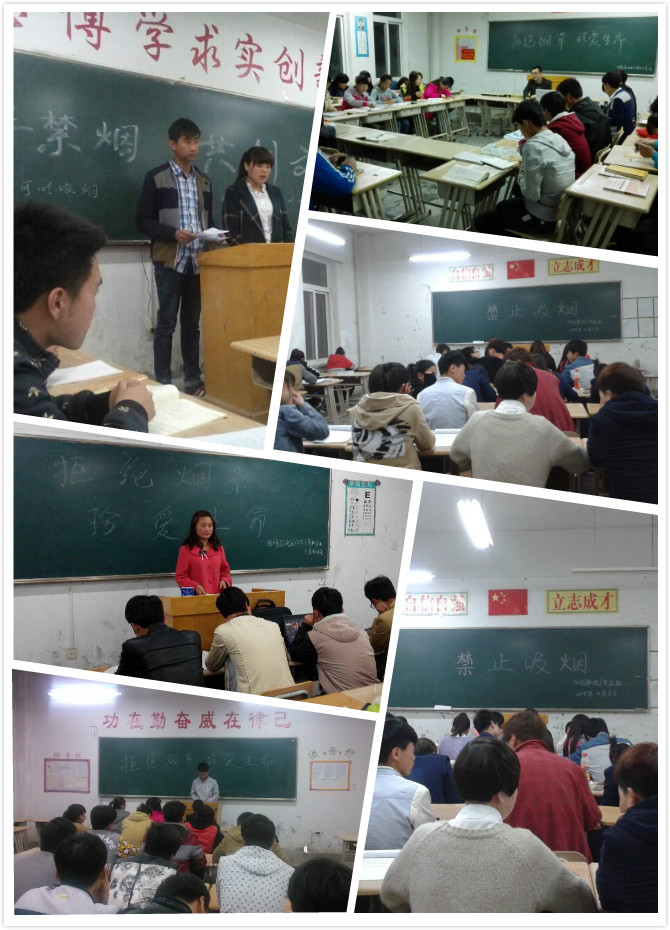 在班會中,各班主任向同學(xué)們宣讀了學(xué)院《關(guān)于在校園內(nèi)公共場所戒煙的通知》和《校園禁煙倡議書》,并提出作為一名學(xué)生,除了要有遠大的理想、高尚的情操、淵博的知識、嚴(yán)謹(jǐn)?shù)募o(jì)律作風(fēng)外,還要有一個健康的身體。為了我們的健康,我們呼吁,同學(xué)們應(yīng)自覺的遠離香煙,并勸說吸煙的親友盡快戒煙。讓我們每一位同學(xué)做出承諾,自覺拒絕煙草,遠離煙草危害。堅決不吸煙,拒吸第一支煙,勸告他人不吸煙,不做吸煙的新一代。人人爭做文明、健康、遵紀(jì)守法的好學(xué)生,使每一位師生都擁有一個健康的生活環(huán)境。