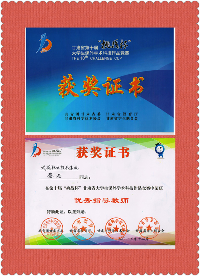 2015年6月23日,現(xiàn)代農(nóng)業(yè)技術(shù)系教師蔡海、李強(qiáng)棟赴西北師范大學(xué),參加由共青團(tuán)甘肅省委、甘肅省教育廳、甘肅省科學(xué)技術(shù)學(xué)會(huì)、甘肅省學(xué)生聯(lián)合會(huì)舉辦的甘肅省第十屆大學(xué)生“挑戰(zhàn)杯”大學(xué)生課外學(xué)術(shù)科技作品競(jìng)賽,獲得優(yōu)秀指導(dǎo)教師榮譽(yù)稱號(hào)。