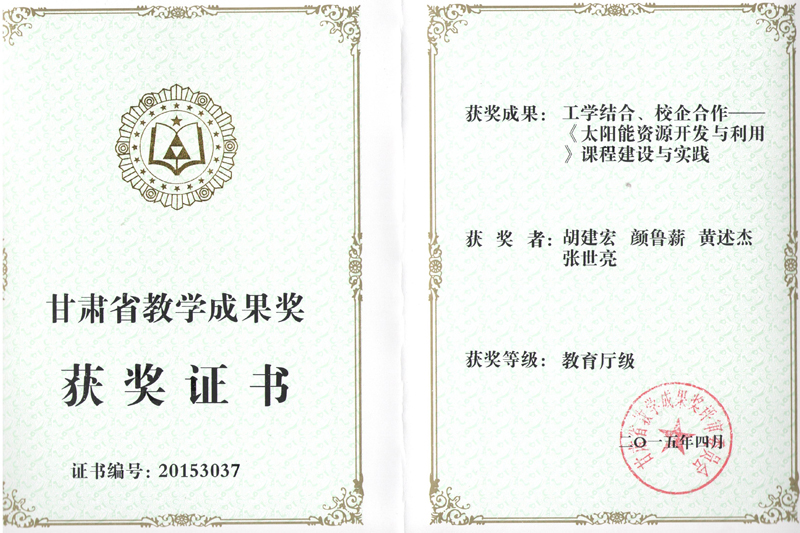 甘肅省教學成果獎:工學結(jié)合、校企合作——《太陽能資源開發(fā)與利用》課程建設與實踐