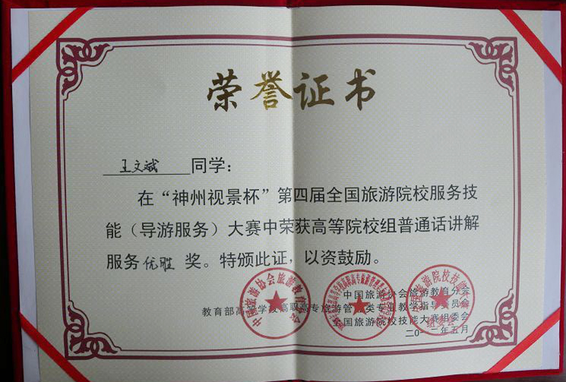 學(xué)生王文斌、凌小花、成玉玲榮獲“神州視景杯”第四屆全國旅游院校服務(wù)技能(導(dǎo)游技能)大賽優(yōu)秀獎。