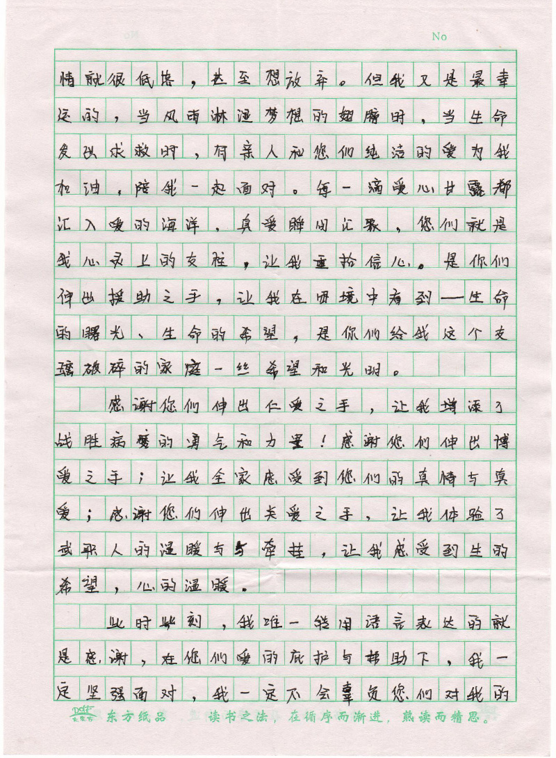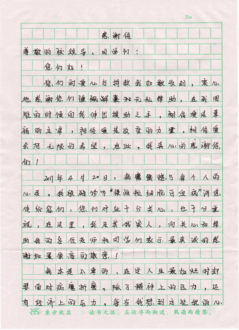 高國棟是我院機械制造系2015級機械設計與制造大專班學生,于2017年4月確診為慢性粒細胞白血病。得知這一特殊情況后,學院宣傳統(tǒng)戰(zhàn)部、團委、學生工作處第一時間向全院廣大師生發(fā)出倡議,號召大家獻出愛心,幫助高國棟同學度過難關。學院廣大師生紛紛解囊,慷慨相助。目前捐助的善款已經交給高國棟同學。為此,高國棟同學特意寫來感謝信,表達對母校廣大師生的感激之情。在此,我們衷心祝愿高國棟同學能在困境中迎難而上,樹立戰(zhàn)勝疾病的信心,爭取早日康復,重返校園。