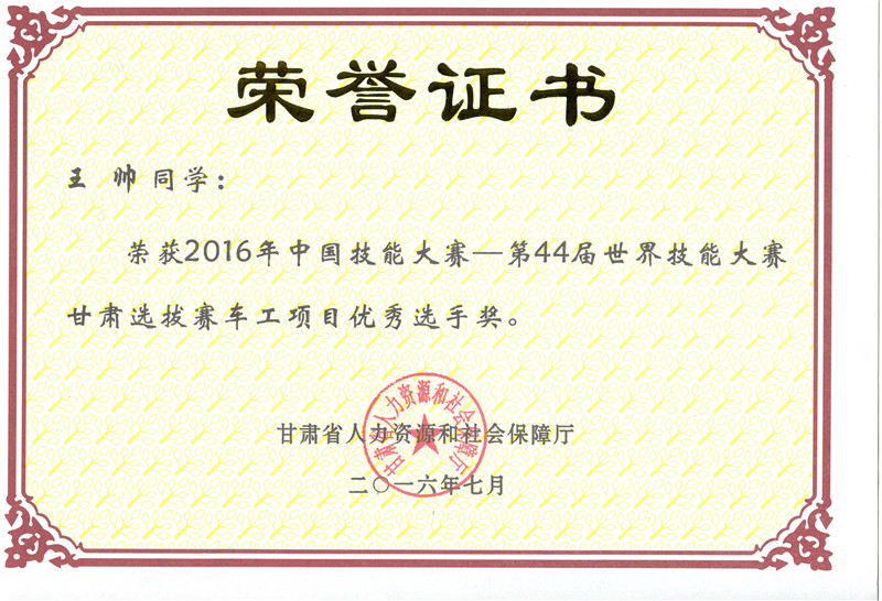 - 上一篇:第44屆世界技能大賽甘肅選拔賽裝配鉗工項(xiàng)目優(yōu)秀獎[ 06-21 ]