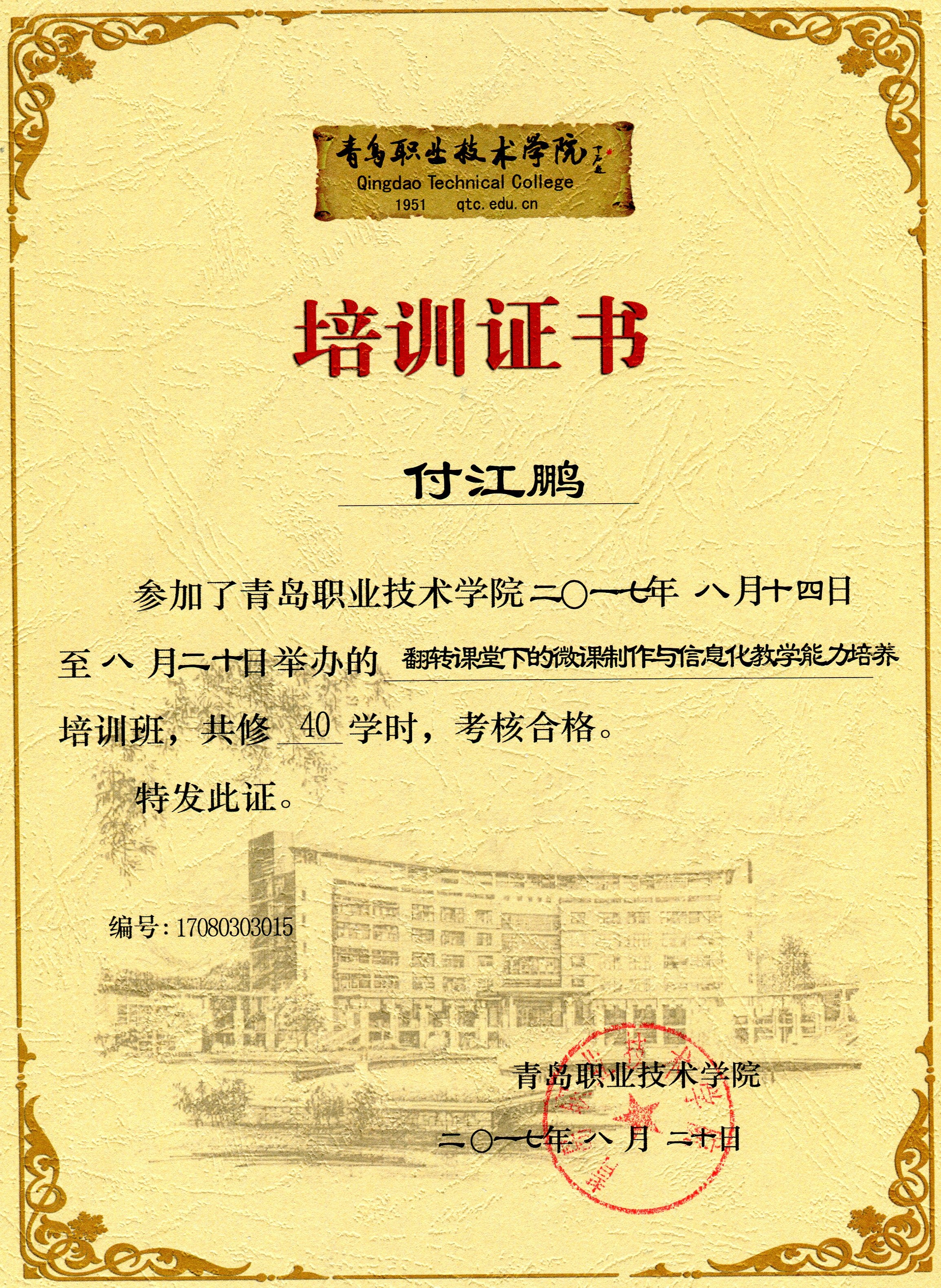 2017.8.14-8.20,我參加了由山東省教育廳在青島職業(yè)技術學院舉辦的《高校教師教學能力、信息技術與專業(yè)素養(yǎng)提升高級培訓班》聯(lián)盟培訓班。