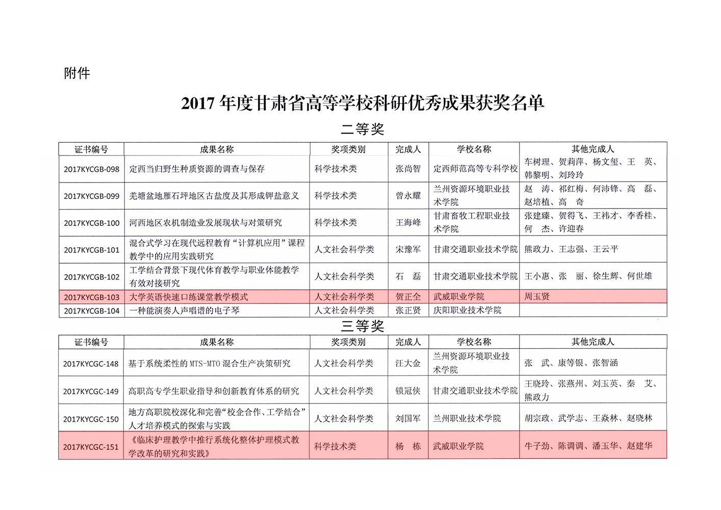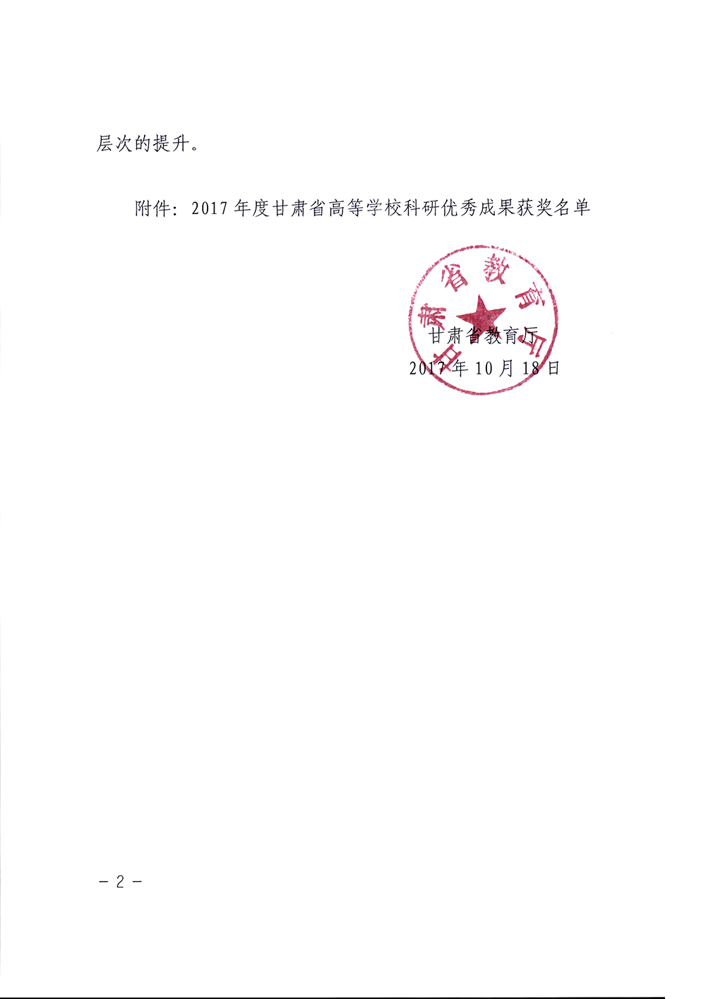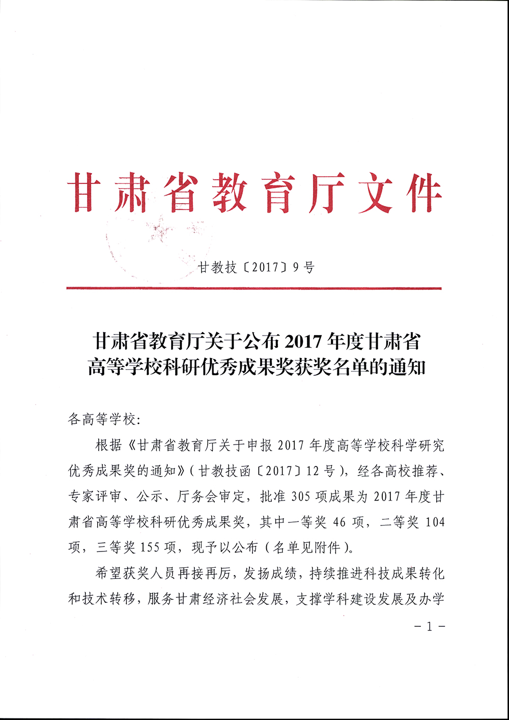 轉(zhuǎn)發(fā)甘肅省教育廳關(guān)于公布2017年度甘肅省高等學(xué)??蒲袃?yōu)秀成果獎獲獎名單的通知