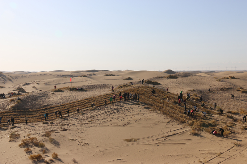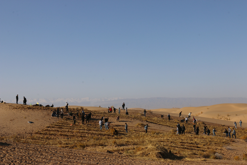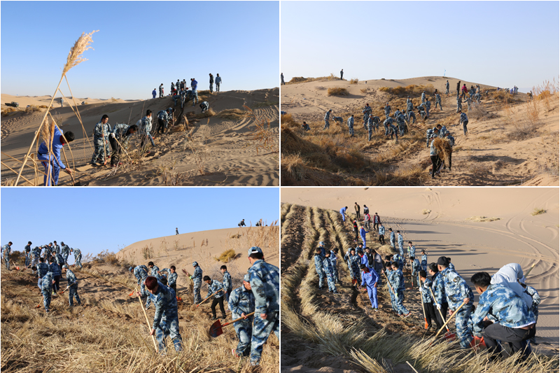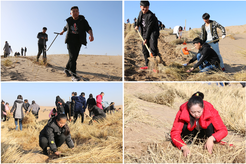 在勞動(dòng)現(xiàn)場,學(xué)院領(lǐng)導(dǎo)和師生們不畏冬寒,分工協(xié)作,按照標(biāo)準(zhǔn)和要求劃線開溝、蒲草培沙、等距離推進(jìn),現(xiàn)場一片熱火朝天的景象?;氖彽纳车厣砼乱拢R的稻草方格逐漸向遠(yuǎn)處的沙丘覆蓋。