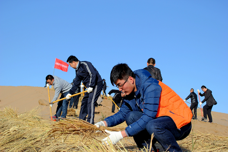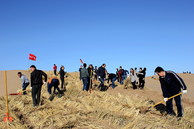 ?11月7日,按照市委市政府統(tǒng)一安排,直屬附屬醫(yī)院干部職工共計(jì)30余人前往涼州區(qū)榮生路南側(cè)八十里大沙頭道槽參加義務(wù)壓沙治沙勞動。在黃沙茫茫的大沙漠上,鮮紅色的醫(yī)院院旗迎風(fēng)招展,醫(yī)院干部職工在沙丘上揮鍬開溝、鋪稻草、培沙土、草方格逐漸覆蓋了一個(gè)個(gè)沙丘,沙丘上的草方格在陽光下金光閃閃……